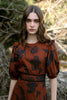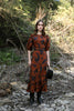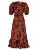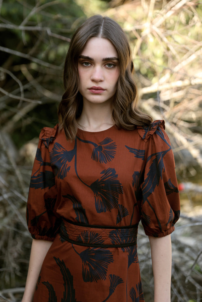The Antonia Noir Bloom Brown Dress is perfect for any occasion, from lively gatherings to casual days. With charming puffed sleeves, elastic cuffs, and delicate frills, it creates a playful, flattering A-line silhouette. The included belt highlights your waist, while breathable cotton poplin keeps you cool and comfy. The ‘Noir Bloom’ pattern beautifully captures the dance of shadows and florals at sunset, adding a touch of magic to your look.