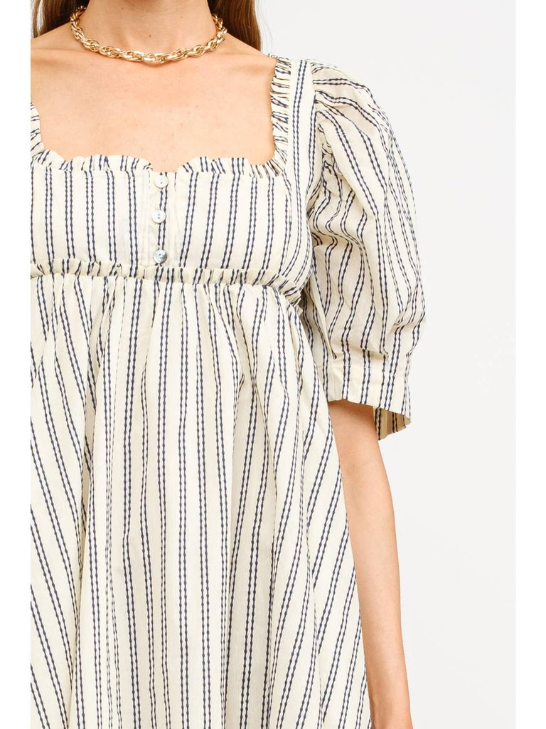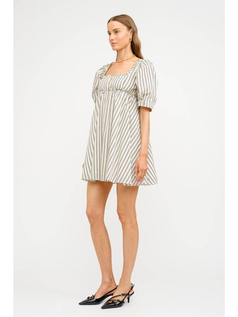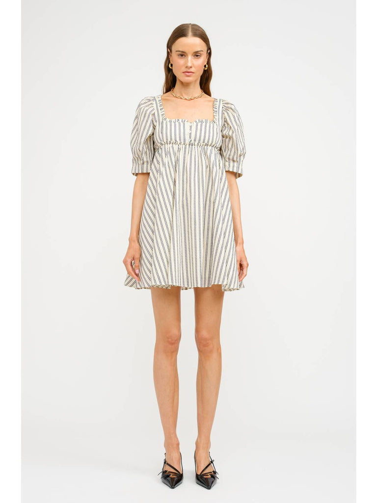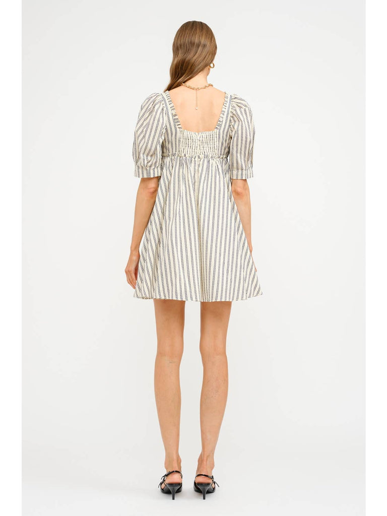 This playful Bobbie Mini Dress in ivory features charming puffed sleeves and a flattering striped pattern, perfect for adding a fun twist to your wardrobe. Crafted for easy care, just hand wash cold and line dry to keep it looking fresh. Whether dressing up or down, it offers a breezy, stylish look that moves with you. Model is 5'11" wearing size small for a sleek fit.