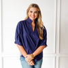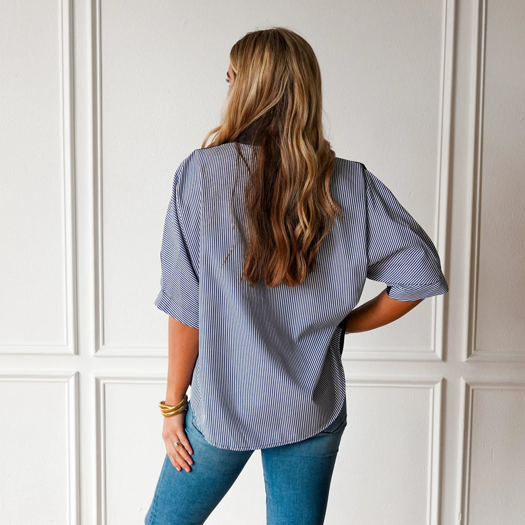 Fall's favorite stripe. The Caroline Top gets a fresh update with bold contrast striping, a relaxed fit, and a pop collar that brings the prep. Pair it with your favorite jeans or layered under a blazer for instant polish. Gathered Sleeve Detail. Solid Front. Striped Back.