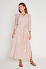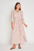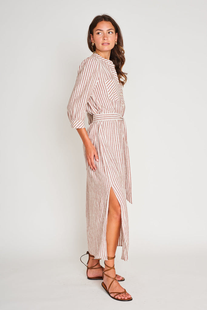 Introducing the Cassie Sedona Stripe Dress - effortless, stylish, and the perfect warm weather staple. Its button-up bodice, 3/4 cuffed sleeves, and tea-length hemline exude simplicity and elegance. Made from red and cream Sedona Stripe fabric, complete with chest pockets and a belted waist.