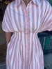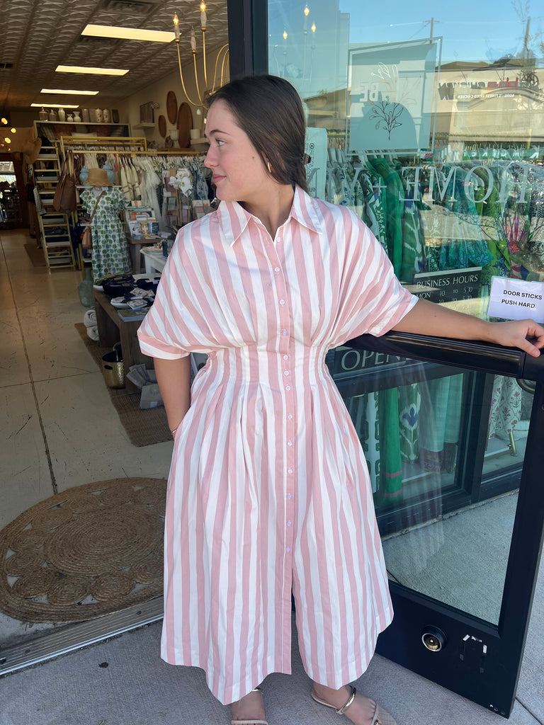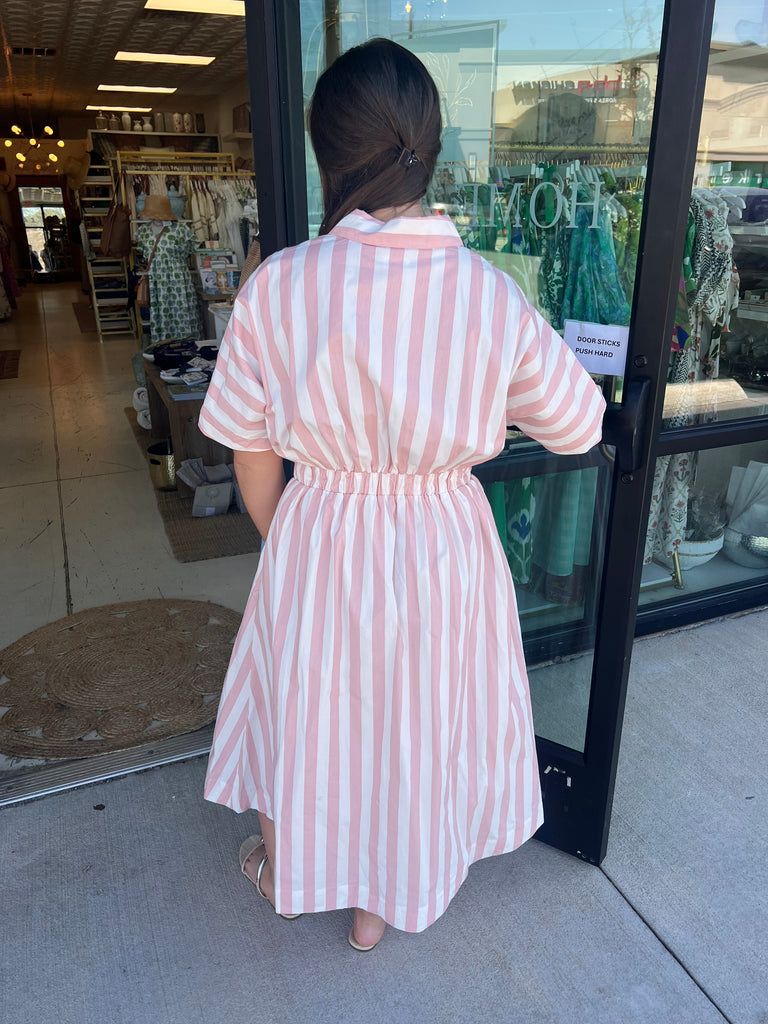 Effortless elegance meets timeless style with this striped midi dress. Featuring a classic pink and white pattern and a flattering cinched waist, the button-down front adds versatile charm for both casual and dressed-up occasions. Perfect for spring outings, weekend brunches, or layering through the seasons. A wardrobe staple that transitions seamlessly from day to night.