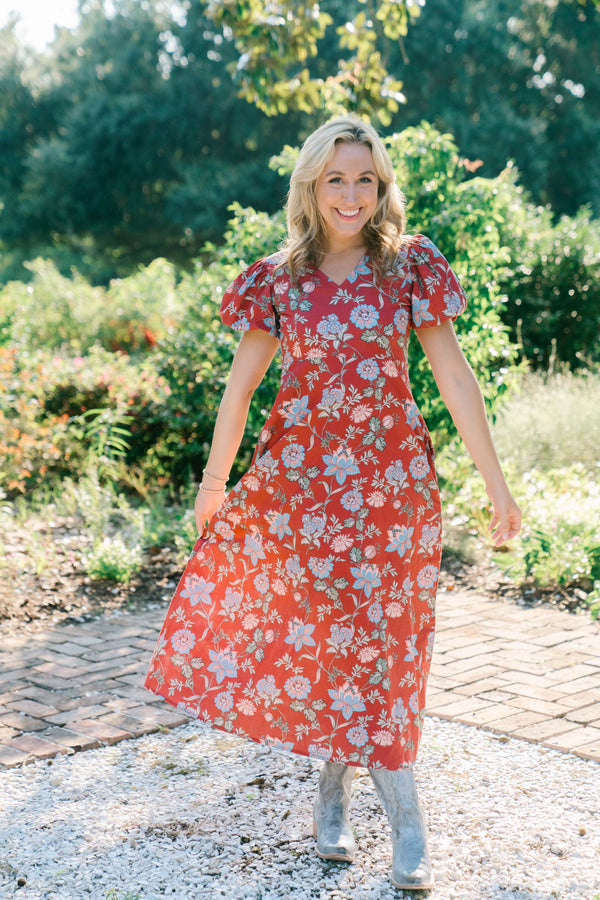 Meet the newest maxi, Clara. It features exaggerated puff sleeves, a v-neckline, and a-line skirt silhouette.