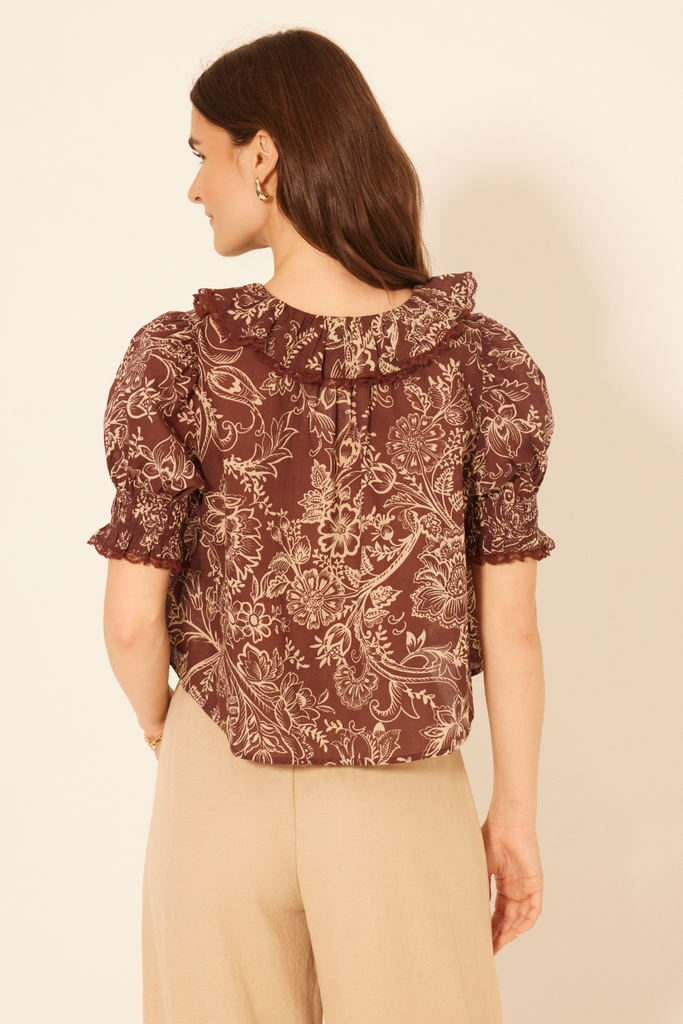 The Gaile Top in Blaze Brown brings playful flair to your fall wardrobe with its ruffle front and smocked sleeves accented by delicate lace. Its short sleeves keep it light and breezy, making it perfect for everyday fun. Made from 100% BCI cotton, it offers cozy comfort with a stylish twist. Hand wash to maintain its charming details.