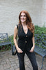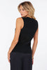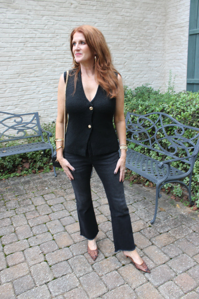 The Gelina Sleeveless Sweater in black is a playful twist on a classic vest. With its cinched waist and deep V-neckline, it offers a flattering fit that’s as fun as it is timeless. Buttoned up the front and finished with a flirty cutaway hem, it’s perfect for layering or wearing on its own when the sun is shining. Made from a comfy blend of acrylic, polyester, and spandex, it moves with you while keeping your look effortlessly polished.
