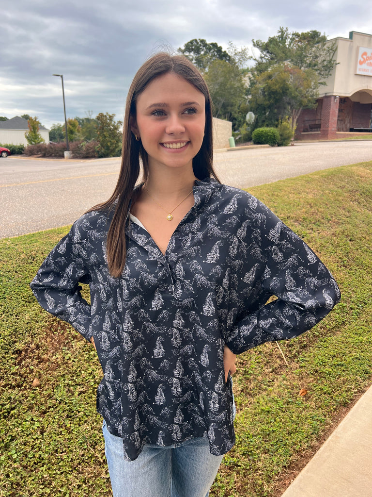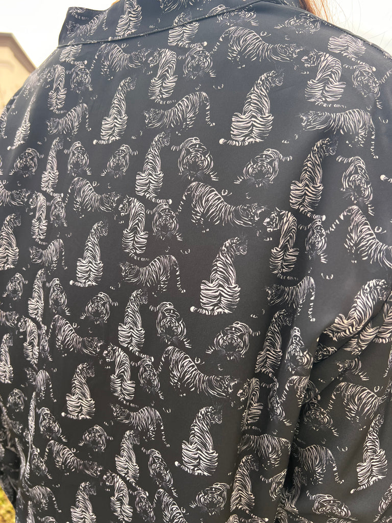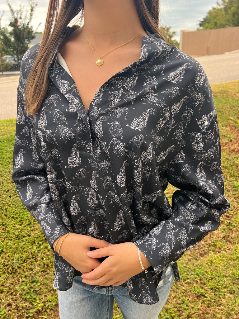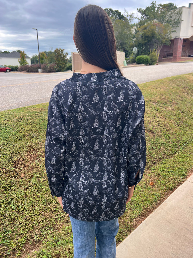Bring playful spirit to game day with the Iris Watercolor Tiger Blouse, featuring a striking navy background adorned with vibrant tiger prints. The long sleeves offer cozy coverage, making it perfect to pair with your favorite jeans and sneakers for a comfortable and stylish look that’s ready for all the excitement.