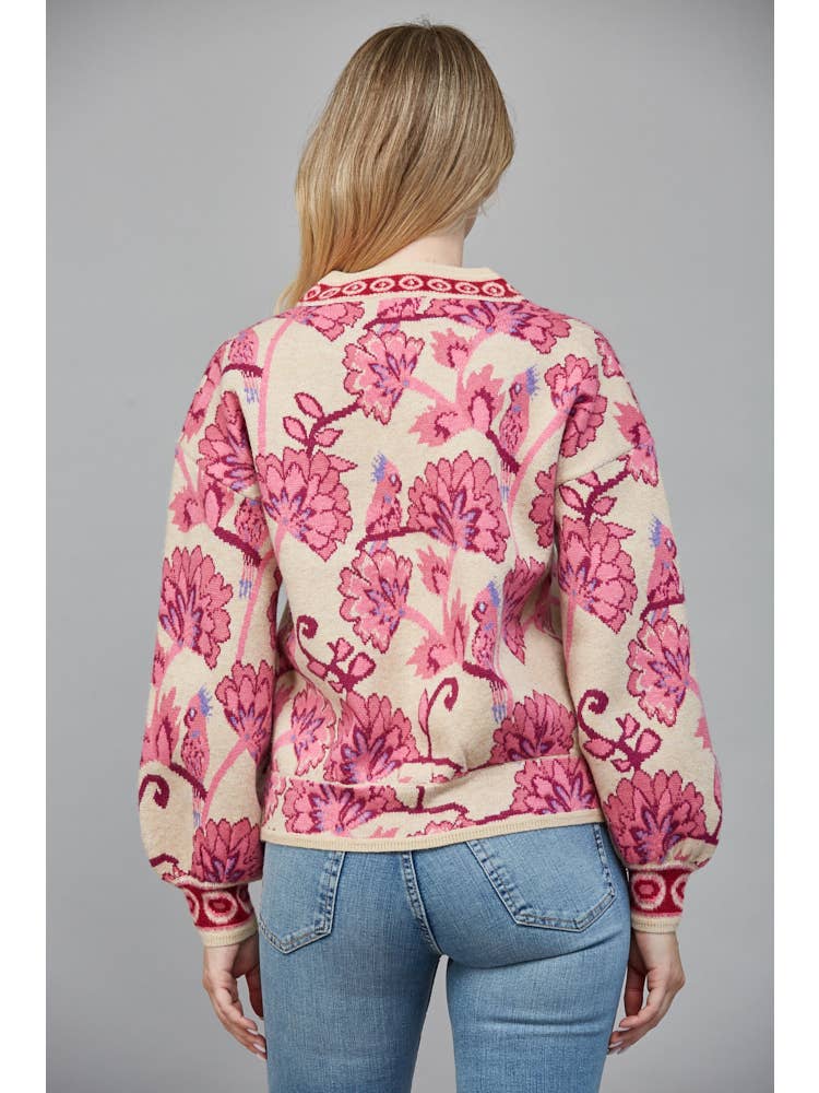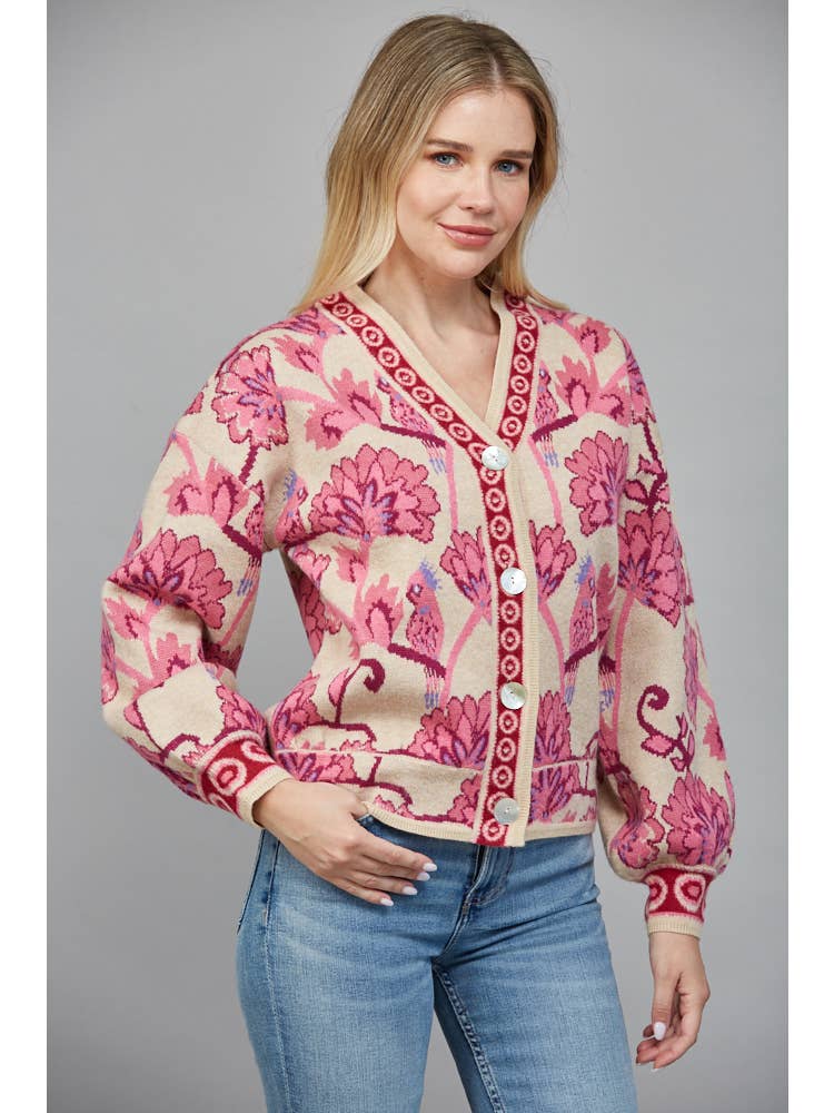 Elevate your wardrobe with the Jaylee Jacquard Cardigan, featuring a bold floral pattern in vibrant pink multi-color. Crafted from a unique blend of acrylic, nylon, PBT, and wool, this knit piece offers both texture and warmth. The daring v-neck silhouette combined with a classic button closure makes it a statement layer that commands attention in any setting. Perfect for those who aren’t afraid to stand out.