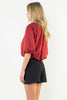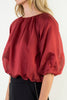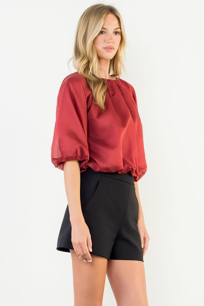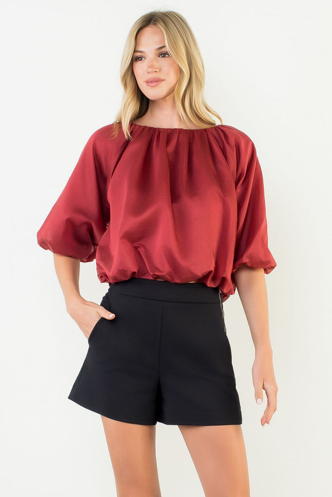 The Julee Burgundy Satin Top showcases a graceful boatneck and dramatic balloon sleeves in a rich burgundy satin. This refined piece exudes sophistication, offering a timeless yet modern silhouette that enhances your wardrobe with effortless elegance.