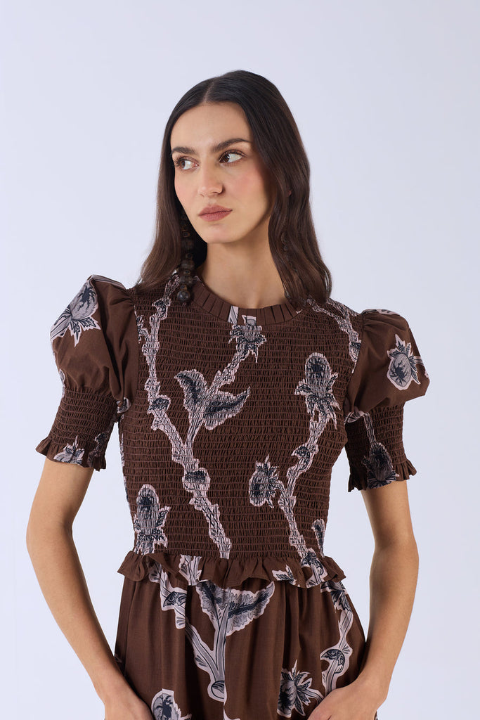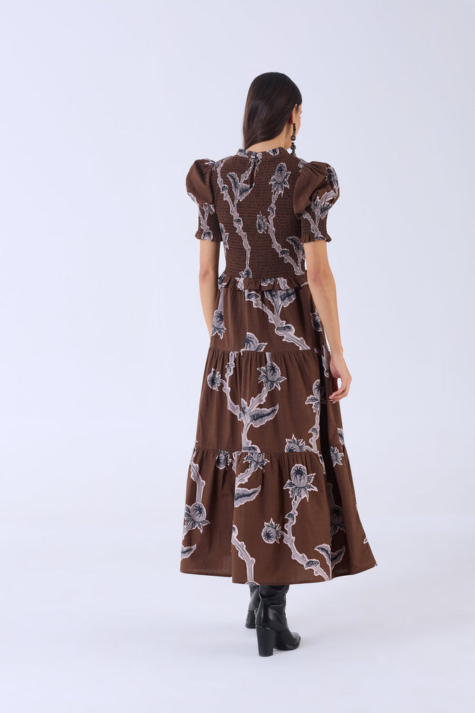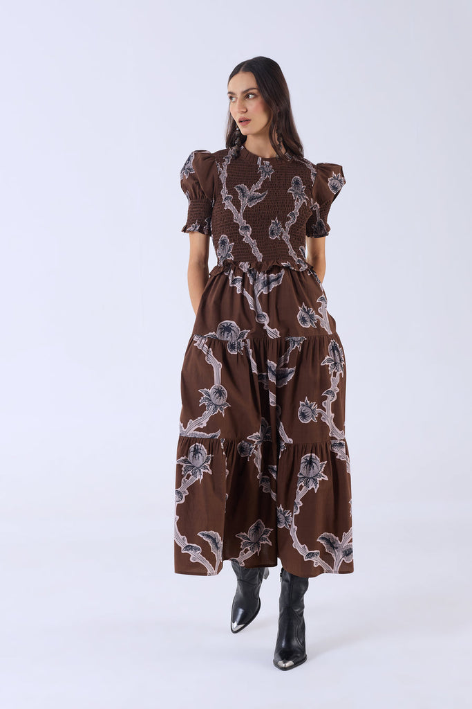 The Klara Woodlands Brown Dress blends sophistication with effortless charm. Its smocked bodice and tiered A-line skirt create a flattering shape, while playful puff sleeves add a fun twist. Delicate frills on the neckline, cuffs, and waist bring a touch of elegance. Made from soft, breathable cotton poplin, it’s as comfortable as it is stylish. Inspired by wild forest flora, the warm brown and vanilla tones celebrate nature’s earthy beauty with a whimsical flair.