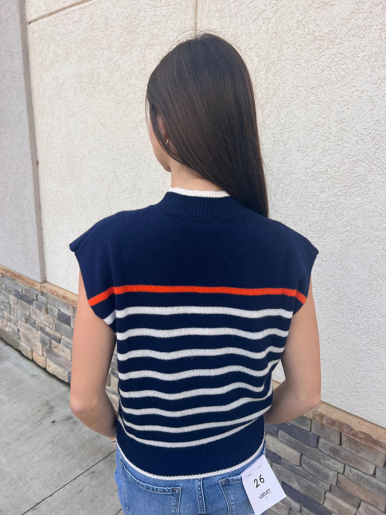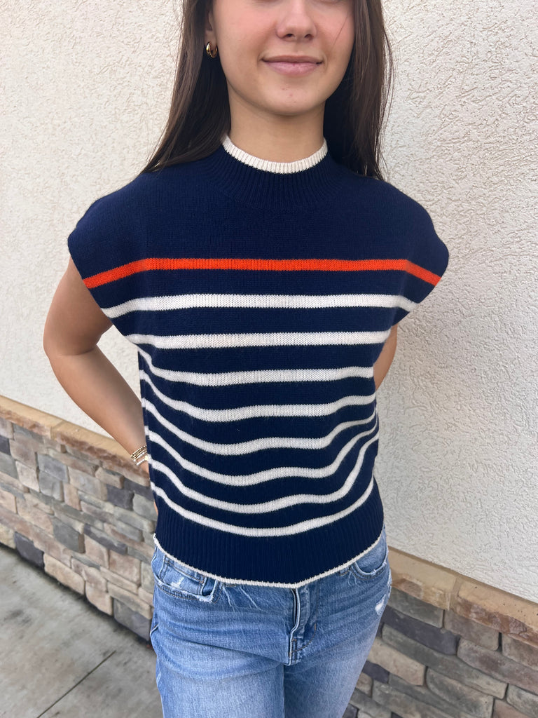 Embrace fall vibes with the sleeveless Lorelai Striped Knit Top. Its cozy knit fabric and playful stripes make it an easy favorite for layering or wearing solo on crisp days. Perfect for adding a splash of fun and warmth to your autumn wardrobe!