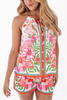 This floral-print halter top has a dainty tie threaded into the neckline so you can adjust the silhouette. Done in a relaxed shape, it decorated with little buttons down the front and accented by a coral and blue border print.