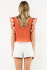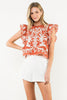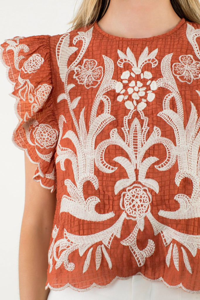 Bring a pop of playful charm to your wardrobe with the Marcia Flutter Sleeve Top. In a warm burnt orange shade, it features delicate ivory embroidery that adds a touch of whimsy. The smocked sleeves create a textured, fluttery effect, making this top both fun and flattering for any casual day out.
