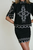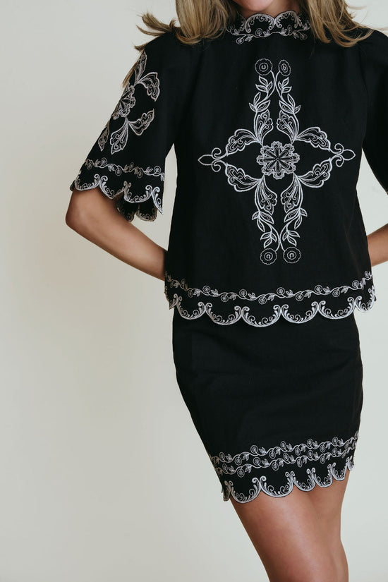 The Tatum Top in Black & White Embroidery combines playful elegance with comfort. Crafted from stretchy cotton flex, it features a high neckline with scalloped edges, long sleeves with elastic cuffs, and a scalloped hem for a delicate finish. A button opening in the back adds a charming detail. Model is 5'8" wearing size XS. Dry clean only to keep this top looking its best.