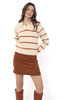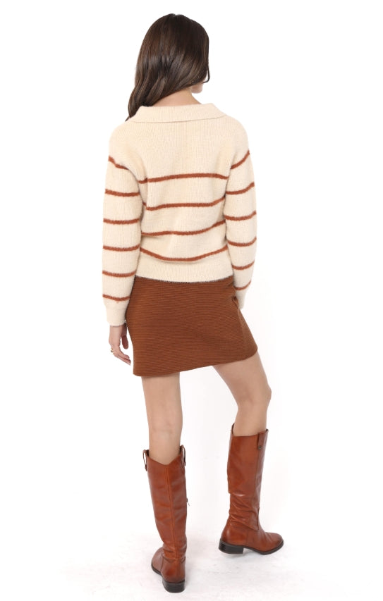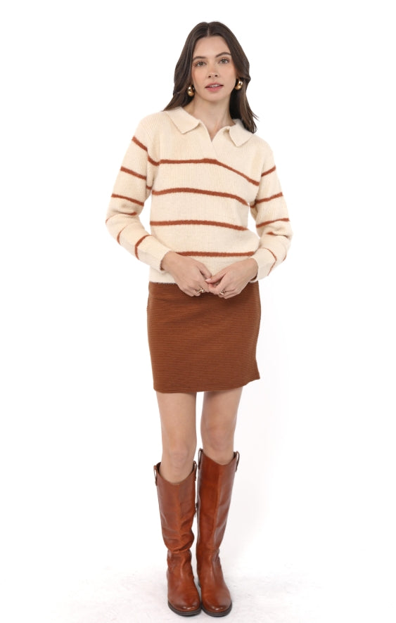 Cozy up in the Tova Eyelash Yarn Striped Sweater, where soft cream and brown stripes meet fluffy eyelash yarn for a fun, textured look. Its long sleeves keep you snug and stylish, perfect for playful days and chilly nights. Add a touch of warmth with a collar that’s as charming as it is comfy!