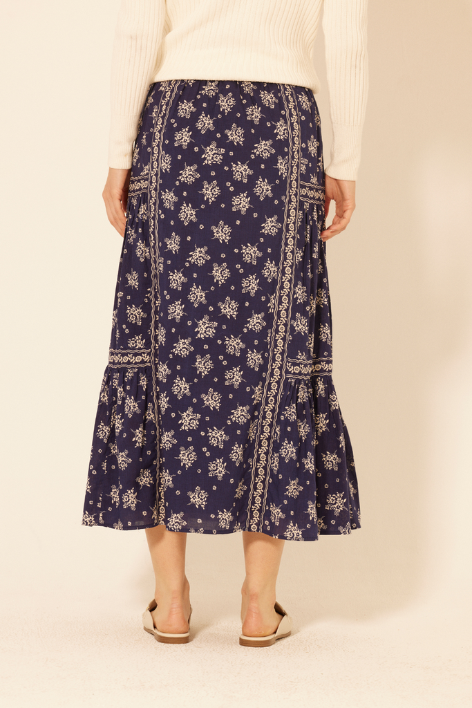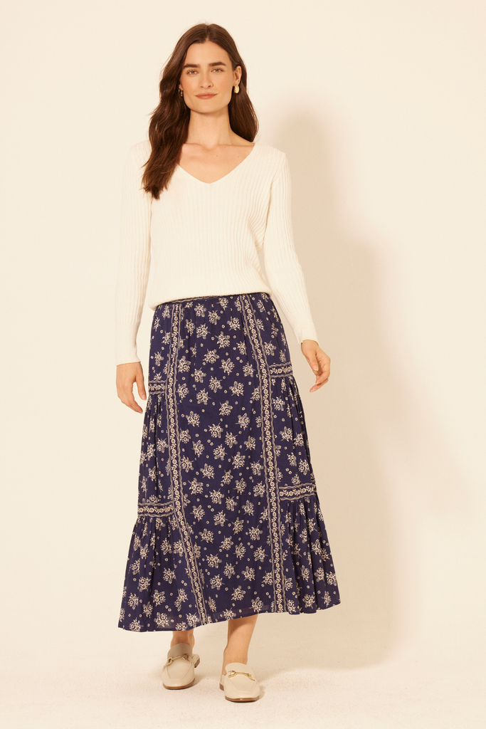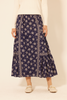 The Valley Crest Skirt in Indigo blends playful style with comfort through its charming border print details and elastic waist. Made from 100% BCI cotton, it offers a soft, breathable fit perfect for everyday wear. Hand wash to keep its vibrant look fresh and fun.