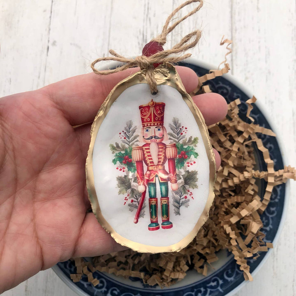 Oyster Ornament | Nutcracker. NC oysters are embellished with decoupage print on the inside and finished with gold enamel on the reverse side to create one of a kind ornaments! A sea glass bead and a jute hanger complete the look. Shells are approx. 3in tall. Details of print and color of bead may vary due to availability, and natural variations in the size and shape of oyster.
