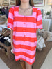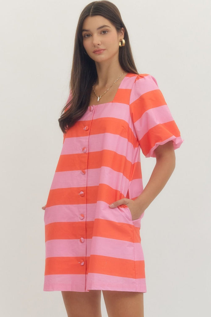 Make a statement in this charming striped mini dress that blends bold pink and orange stripes for instant personality. The **short puff sleeves** add a flirty touch, while the **front button closure** and **side pockets** deliver both style and practicality. Crafted from lightweight woven fabric with a full lining, it's non-sheer and ready for anything—from casual outings to weekend adventures. Perfect for those who love color and aren't afraid to show it off!