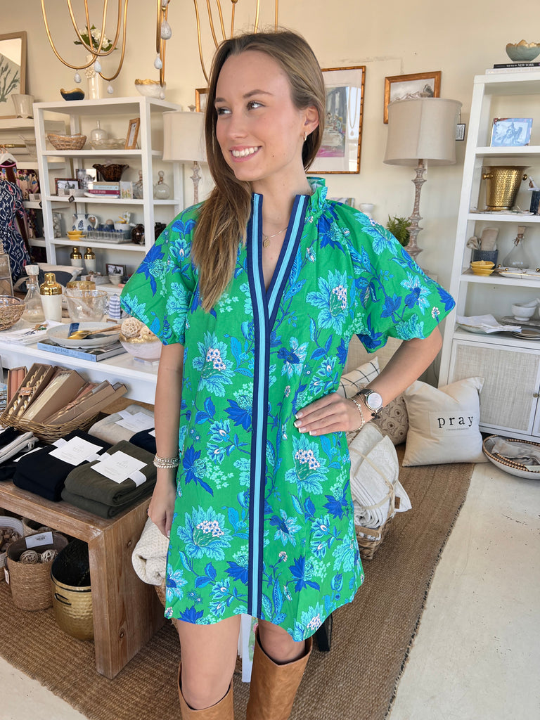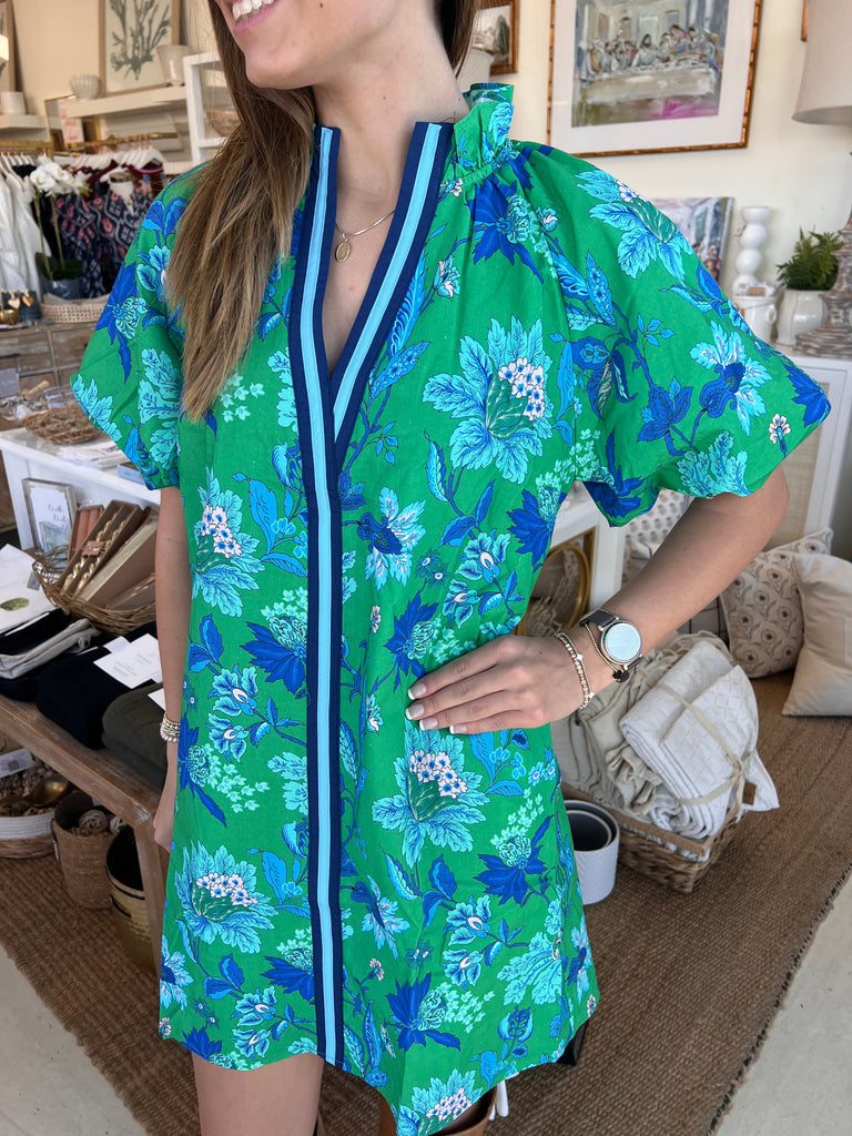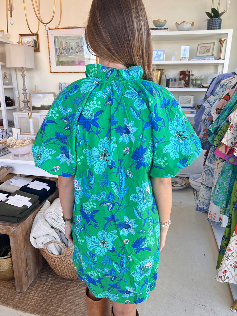 Slip into effortless charm with the Lennox Bright Botanic Mini Dress. This playful piece features a vibrant kelly green base adorned with indigo, violet, and seafoam botanical prints that bring nature's palette to life. The flattering V-neck ruffle collar adds a touch of whimsy, while delicate bubble sleeves keep things fun and flirty. Lined for comfort and complete with hidden pockets—because style should never sacrifice practicality. Perfect for garden parties, weekend adventures, or whenever you want to brighten the room.