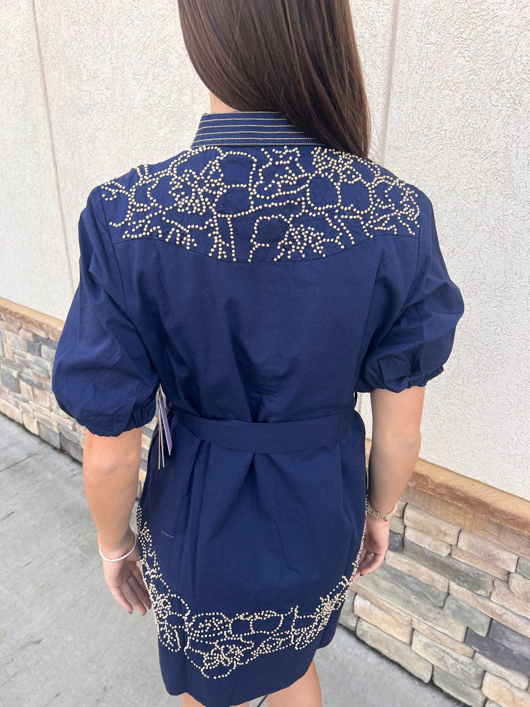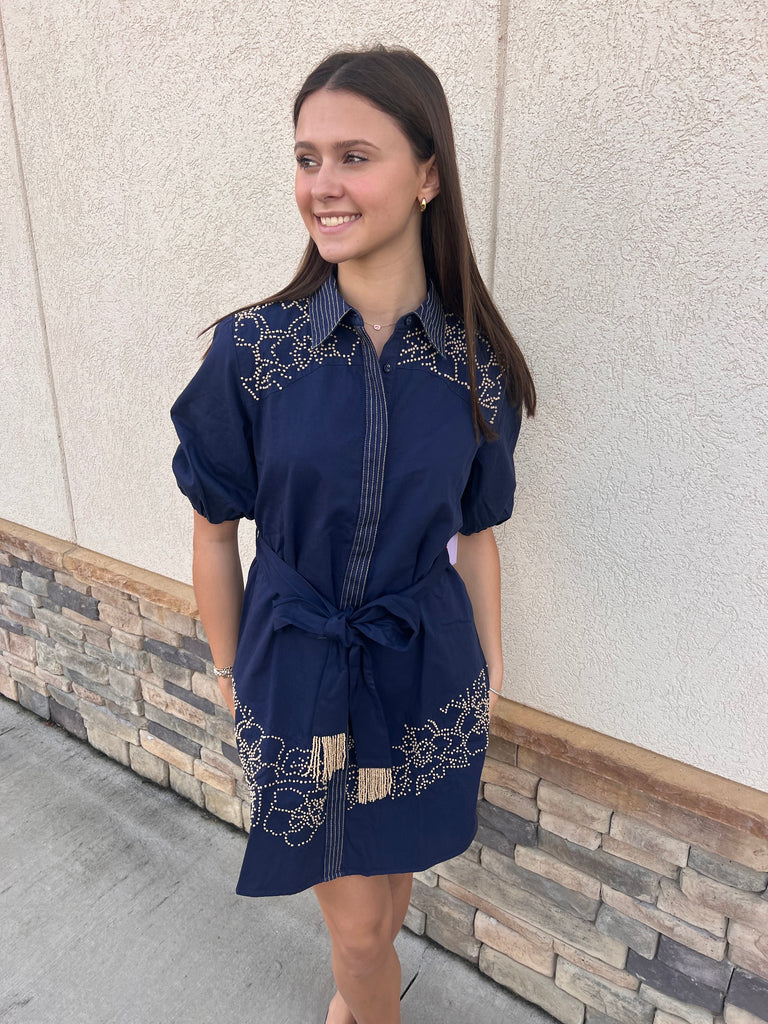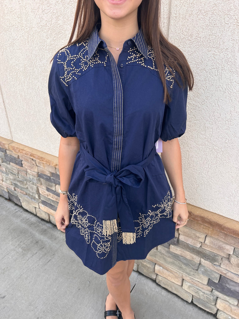 Get ready to turn heads in this Navy French Knot Short Dress. With beautiful beading and a button-down shirt style, you'll feel effortlessly chic. Plus, the belt with beaded ends adds a touch of glamour to this playful and stylish dress. Make a statement and have fun with fashion!