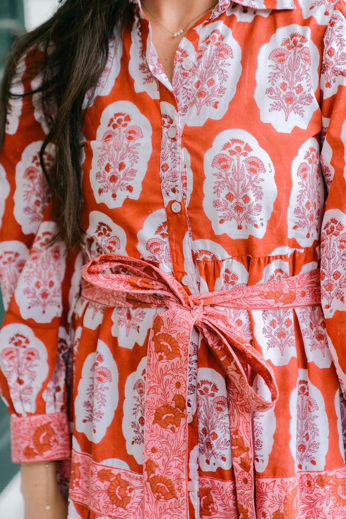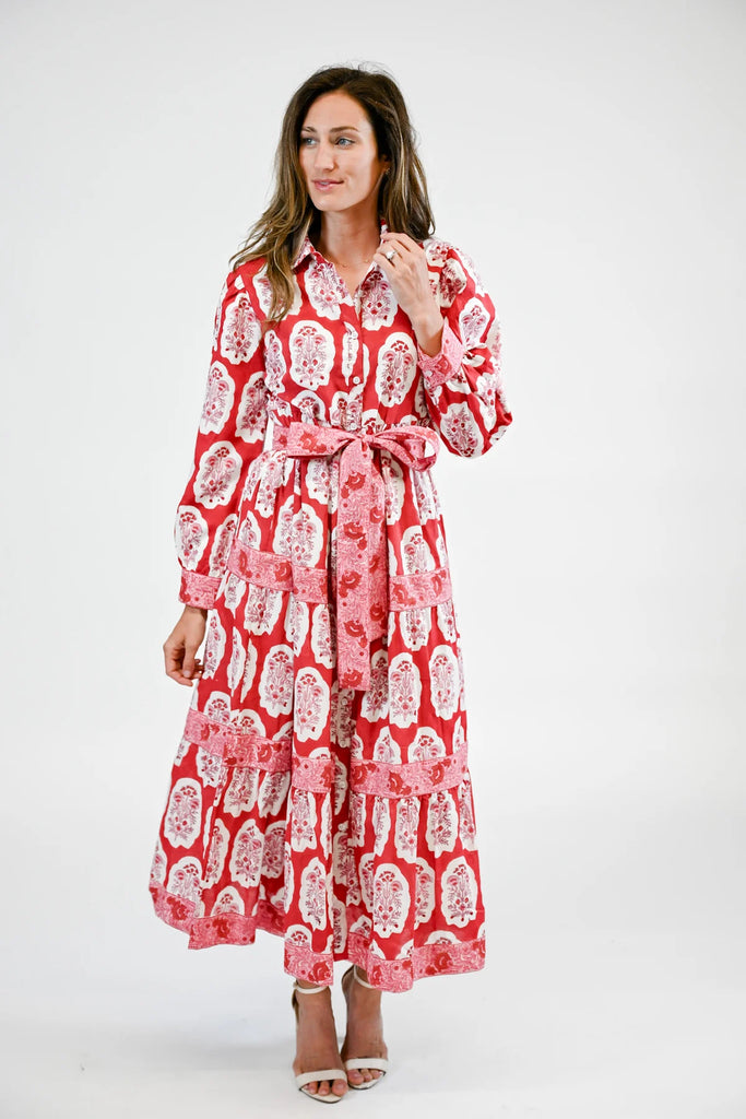 The Rose features buttons down the front, full length sleeves, tiered ruffle skirt, and a matching self tie belt.