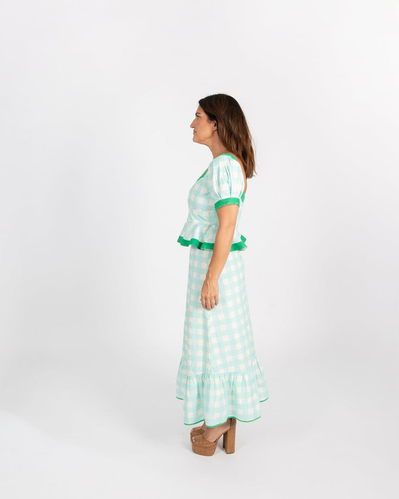 Introducing the Addie Puff Sleeve Top—a peplum style that's all about flattering silhouettes and fun details! This fitted (but never tight) beauty features a voluminous puff sleeve and a strategically-placed peplum ruffle that covers what matters while adding a cheeky flounce. Crafted in a charming blue buffalo check with green accents, the thoughtful detailing is impossible to miss. Pair it with the matching Addie Skirt for a coordinated look, or style it solo with your favorite pants for effortless versatility.