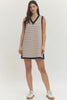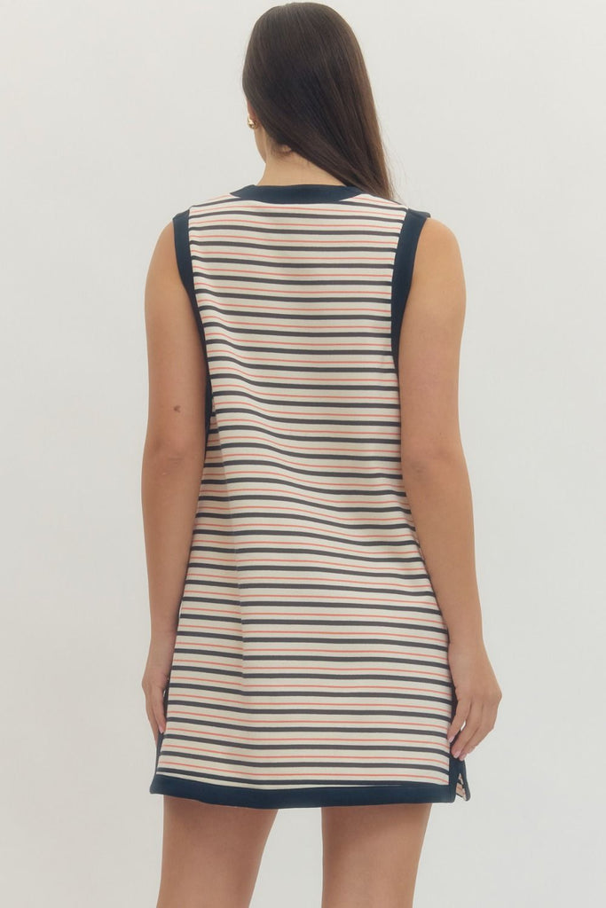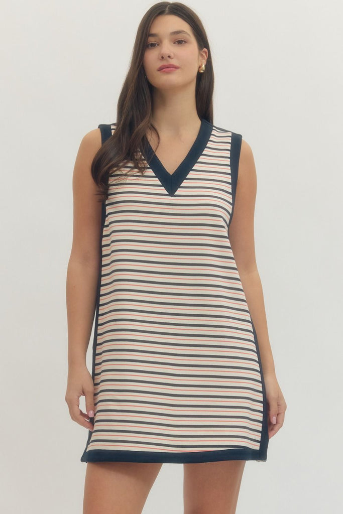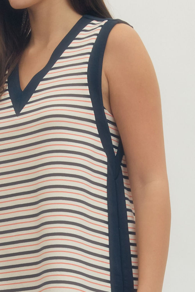 Effortlessly chic and ready for anything, this navy striped mini dress brings casual cool to your everyday rotation. The sleeveless silhouette features a striking contrast V-neck band and armhole binding that adds visual interest, while a convenient side slit keeps things comfortable and breezy. Crafted from a lightweight cotton-spandex blend, it's non-sheer and unlined for a relaxed, breathable fit. Perfect for layering or wearing solo, this striped stunner transitions seamlessly from weekend brunch to evening plans.