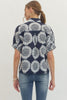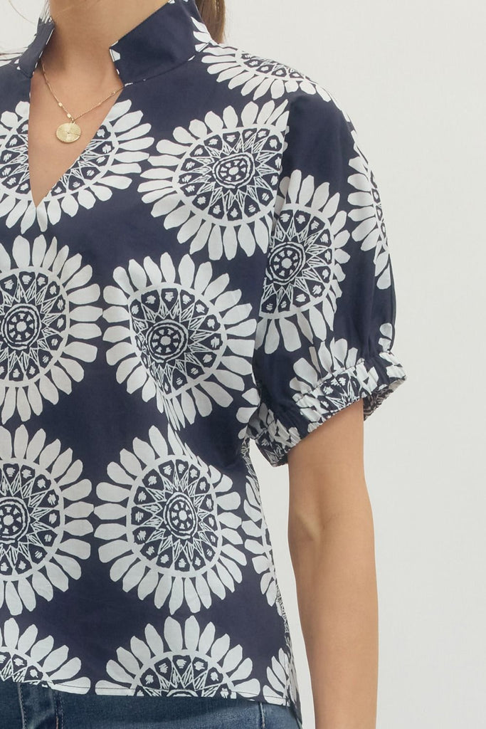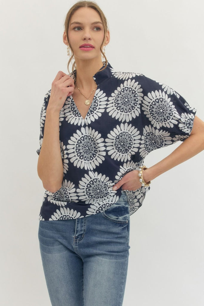 Meet your new go-to top! This playful Krystina Navy features an eye-catching geometric medallion print that brings instant personality to any outfit. The split neckline and elasticated sleeves offer a relaxed, effortless vibe, while the structured back yoke with center pleat adds just the right amount of polish. Crafted from 100% cotton, it's lightweight and breathable—perfect for layering or wearing solo. Non-sheer and unlined for comfort all day long.