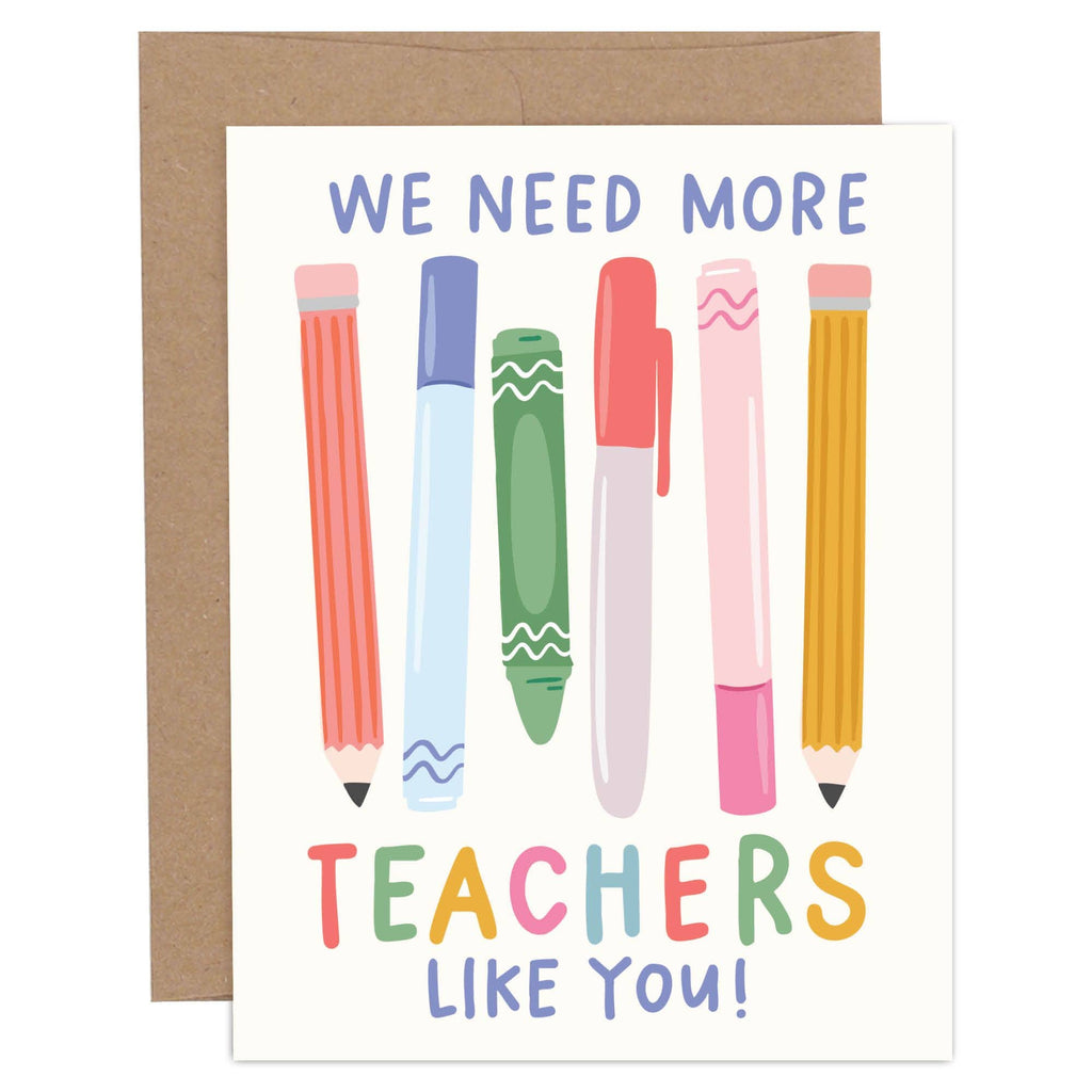 Celebrate your favorite educator with this hand-illustrated teacher appreciation card that says, “We Need More Teachers Like You!” Featuring colorful pencils, pens, and crayons, this greeting card is perfect for saying thank you during Teacher Appreciation Week, the end of the school year, or anytime you want to show gratitude. It’s a heartfelt way to recognize teachers, counselors, or school staff who go above and beyond. Tuck it into a classroom gift basket, attach it to a coffee shop gift card, or pair it with a set of school supplies. A great choice for students, parents, or coworkers to brighten a teacher’s day.
