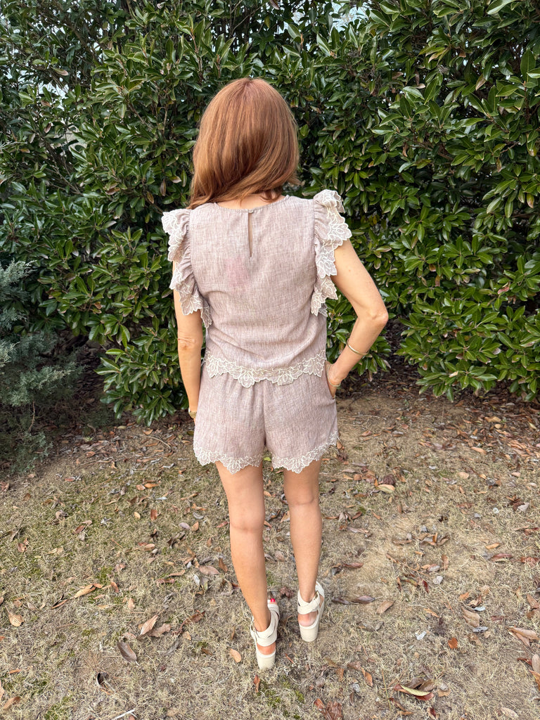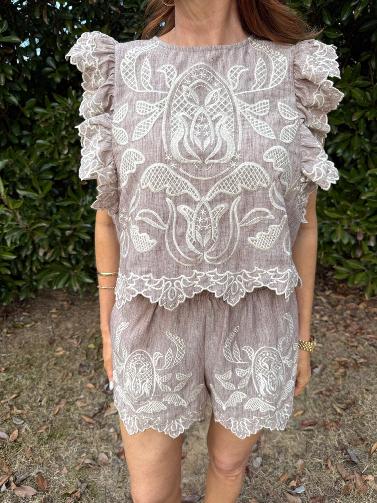 Meet The Good Life Top—your new wardrobe muse! With its vintage vibes and intricate embroidery, this cropped charmer serves up soft ruffle sleeves that dance like no one's watching. Dress it up or down, because style is all about balance (and maybe a little mischief!). Perfect for daydreaming or night scheming!