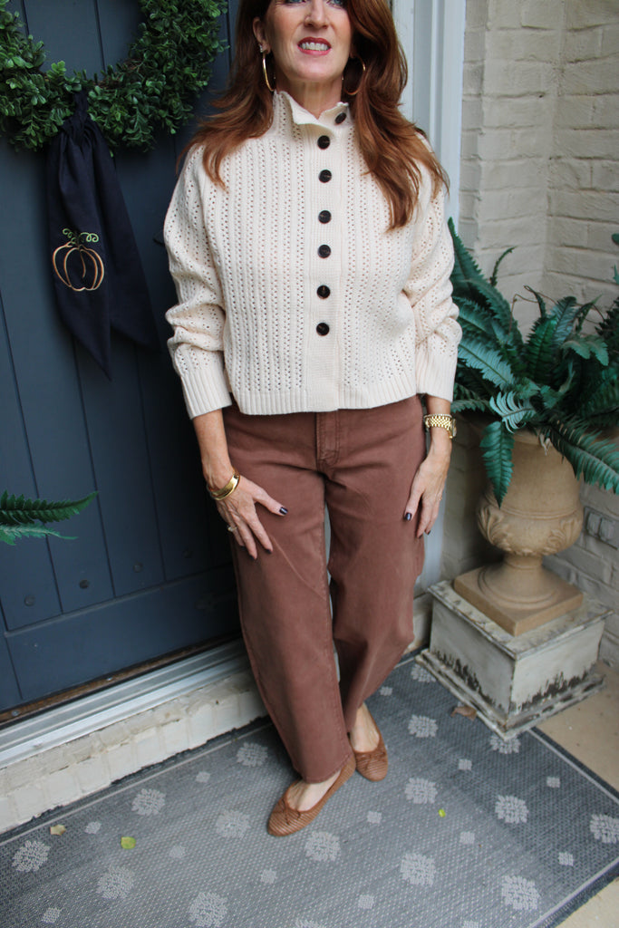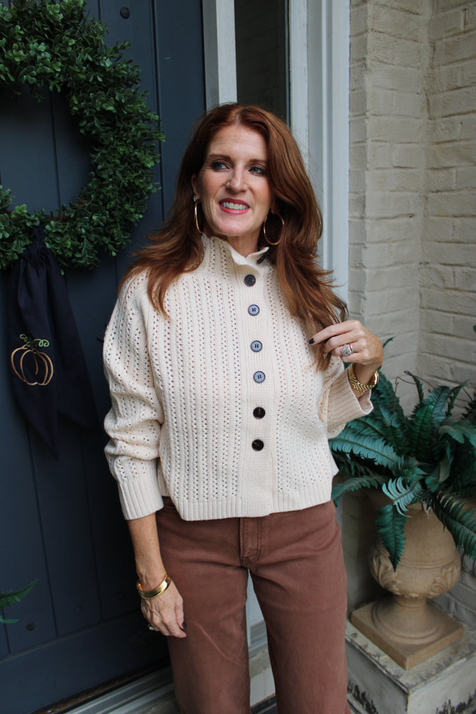 The Bynn Sweater in cream is your cozy companion with a playful twist. Its chunky knit and bold pointelle texture bring warmth and style together, while the turtleneck and raglan sleeves add a relaxed, comfy vibe. The partial front button closure gives just the right touch of flair, making it perfect for layering up and standing out all season long.