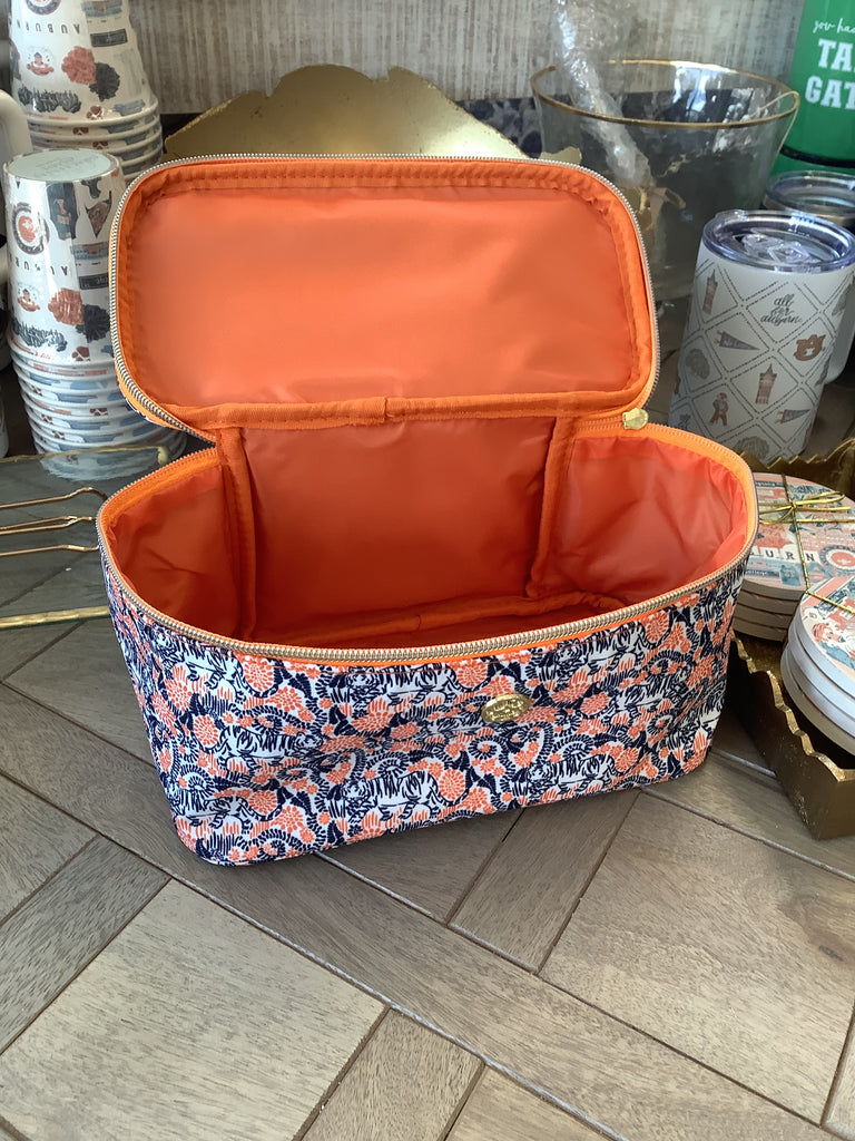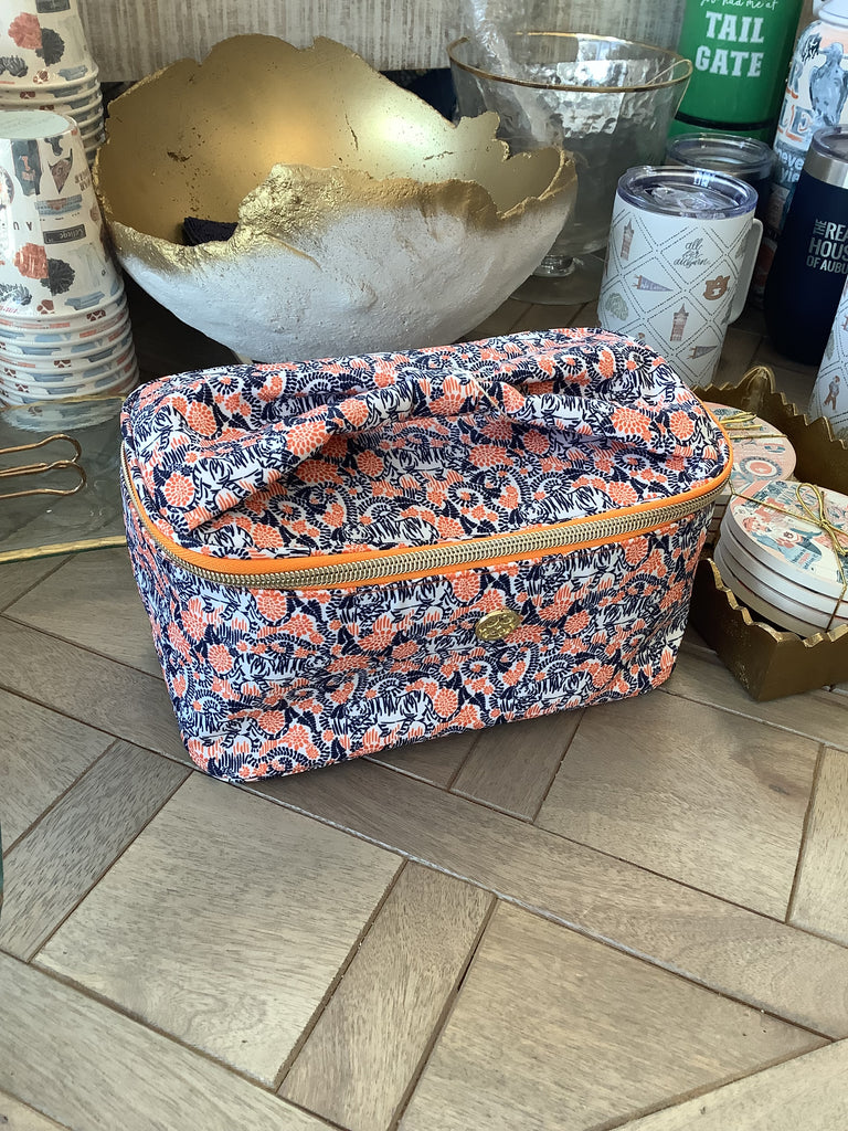 The Kiss & Make Up Tiger Lounge Small Tote bursts with playful spirit, showcasing a striking orange, blue, and white tiger pattern enhanced by elegant gold accents. Its charming bow handle adds a fun twist, while the vibrant orange interior liner keeps your essentials bright and organized. Designed for versatility, this multi-use tote effortlessly combines style and practicality to brighten any day.