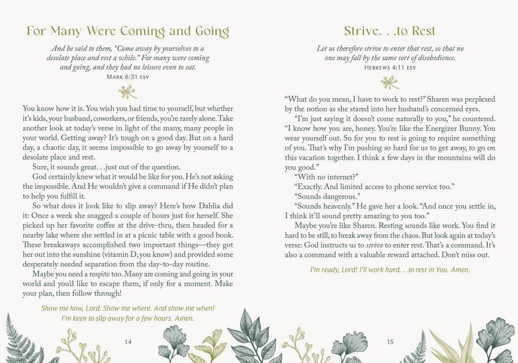 Any time your beautiful soul craves peace and stillness, you'll find just the encouragement, inspiration, and biblical truth you need in this delightful devotional. These 180 refreshing readings touch on topics most important to you. Read on and rest your soul in the heavenly Father's comforting embrace.