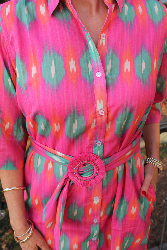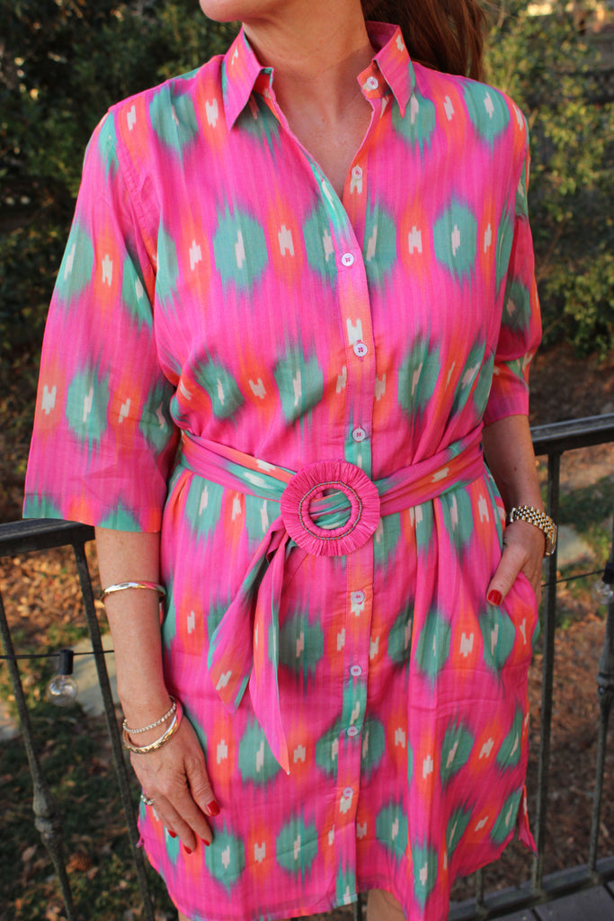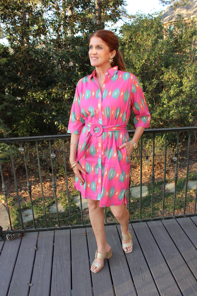 Get ready for spring with our Camden Shirt Dress! Made of 100% lightweight cotton, this dress features a collar, attachable belt, and 3/4 sleeves. A versatile and stylish addition to your wardrobe, it's the perfect spring staple.