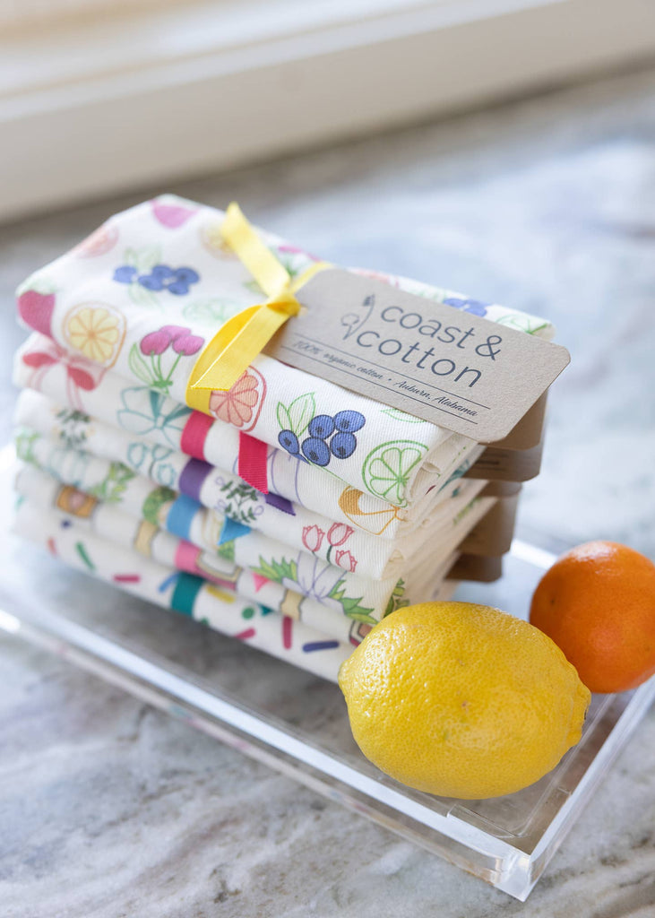Towel Specifications: + Organic cotton tea towel measuring 20 x 26 inches, printed all over + Original, hand-drawn design printed with colorfast, water based dyes + Wrapped with coordinating ribbon & a recycled paper tag