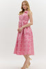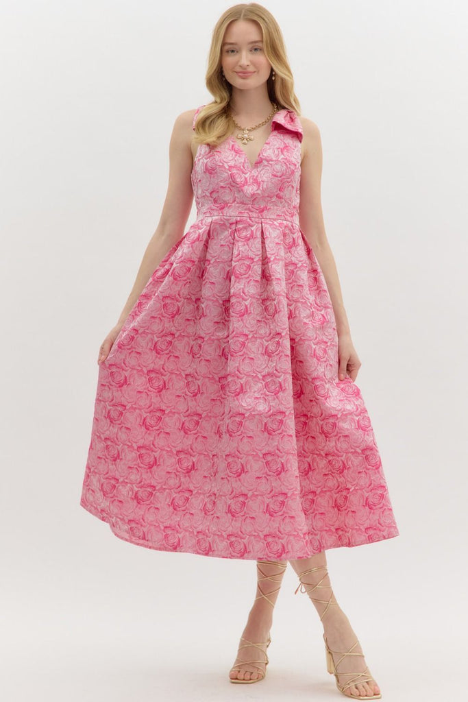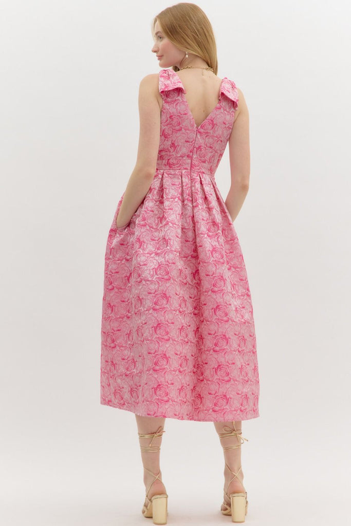 Release your inner fashionista and bloom in style with our La Belle Floral Dress. Featuring a textured floral design and a playful V-neck, this sleeveless pleated midi dress is perfect for any occasion. The oversized bow on the shoulder adds a touch of fun and the pockets at the sides add functionality. With a zipper closure at the back and a lightweight, non-sheer fabric, staying stylish and comfortable has never been easier. So why wait? Get your hands on this dress now and turn heads wherever you go. (Model is 5'10" and wearing size Small.)