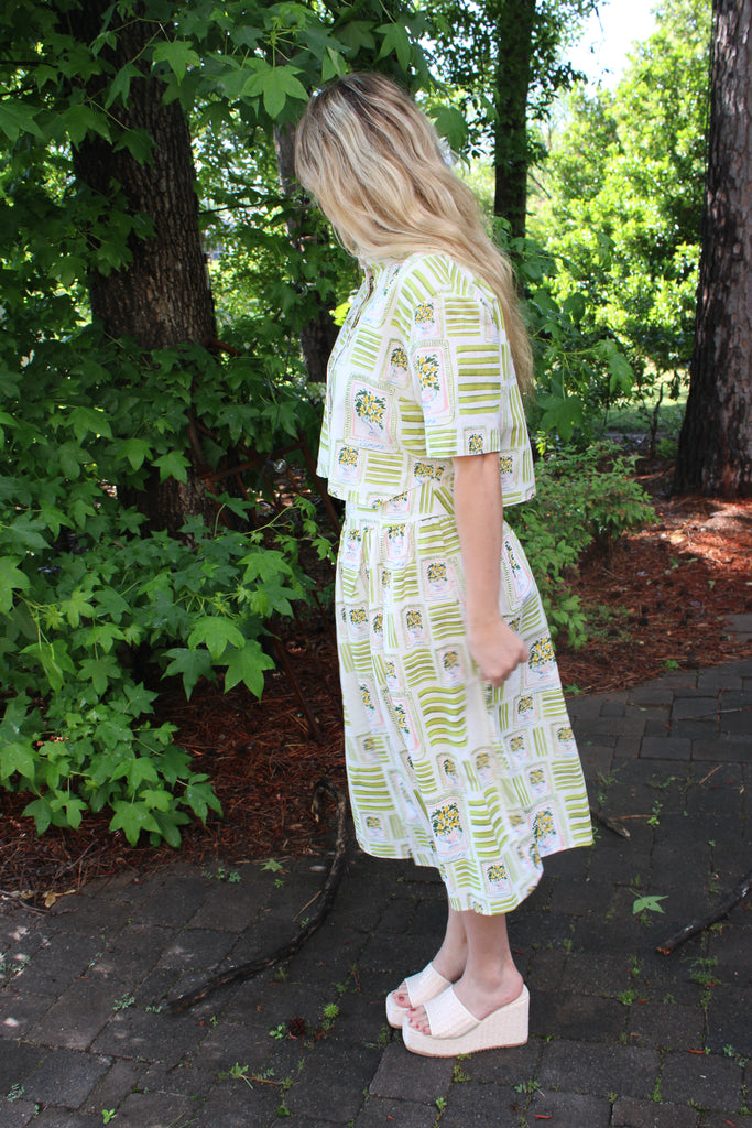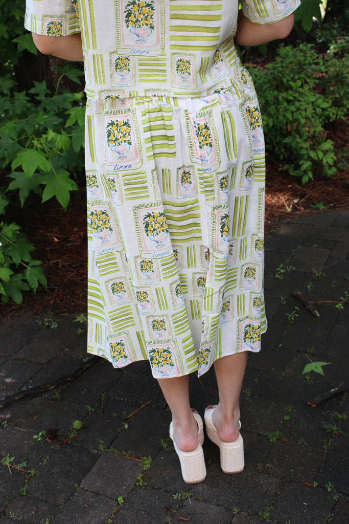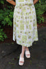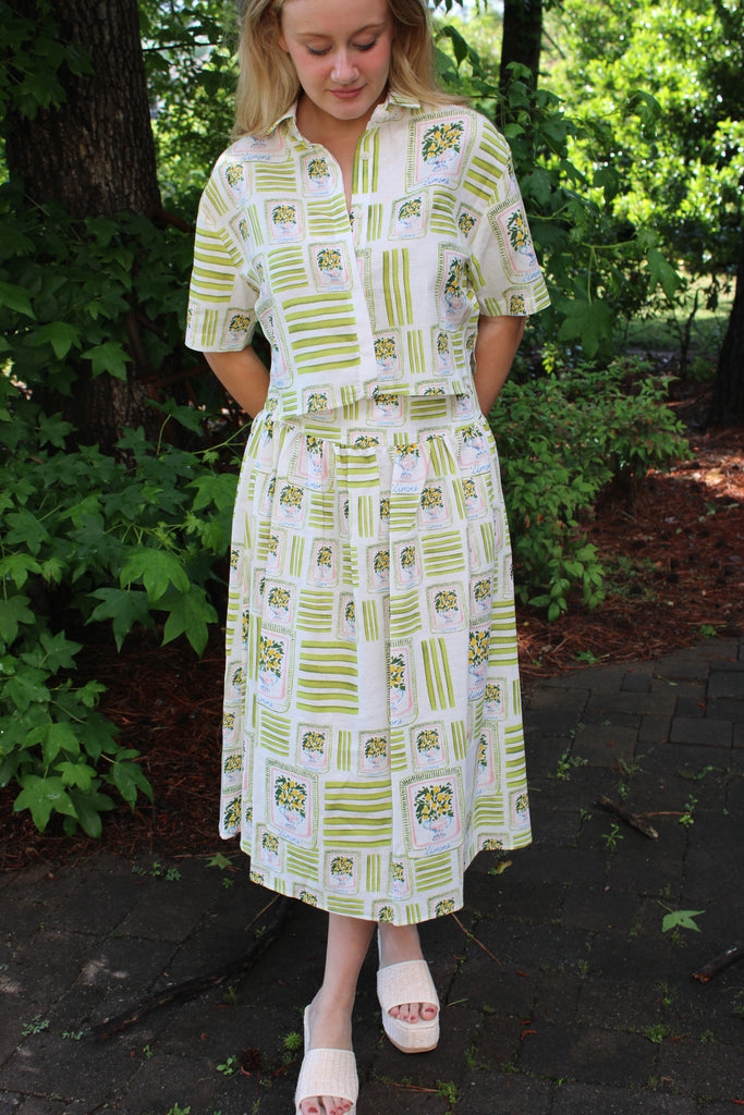 Introducing Lulee Lemon Skirt! Add a playful touch to your wardrobe with this breezy, mid-length skirt. The high-waisted design and patchwork-style print of lemon tree vases and soft green stripes exude a vintage market feel with a modern twist. Made from 55% linen and 45% cotton. Don't forget to pair it with the Pippa Lemon Top!
