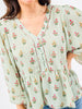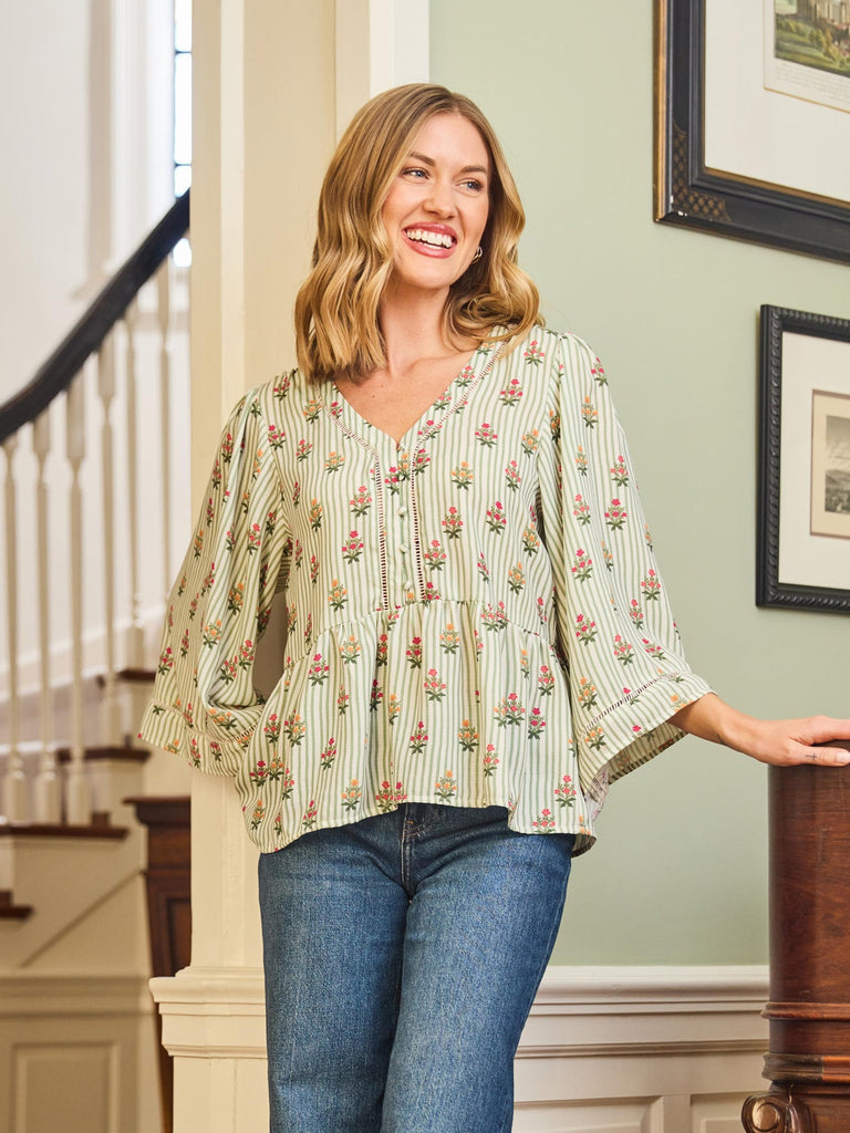 The Monroe Cottage Stripes top in green offers a relaxed yet stylish silhouette with its flattering v-neckline and dramatic bell sleeves. Unique ladder trim details on the placket and sleeves add a distinctive touch, making it versatile for both casual outings and more dressed-up occasions. Crafted from 100% polyester, it ensures easy care—just machine wash cold with like colors and hang to dry for lasting wear. This top effortlessly blends comfort with chic details to support your everyday style.
