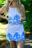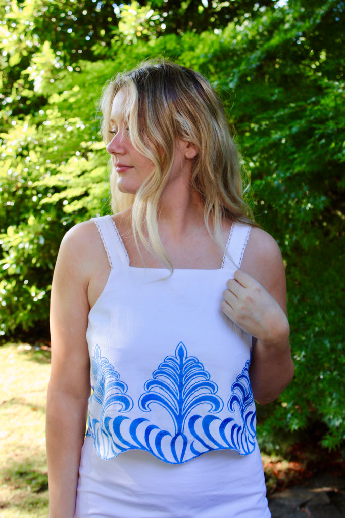 Stay cool and stylish this summer with our Rowen Embroidered Strappy Top. Made with 100% cotton, this top features beautiful blue embroidery on a crisp white background. Pair it with our matching mini skirt for the perfect summertime look!