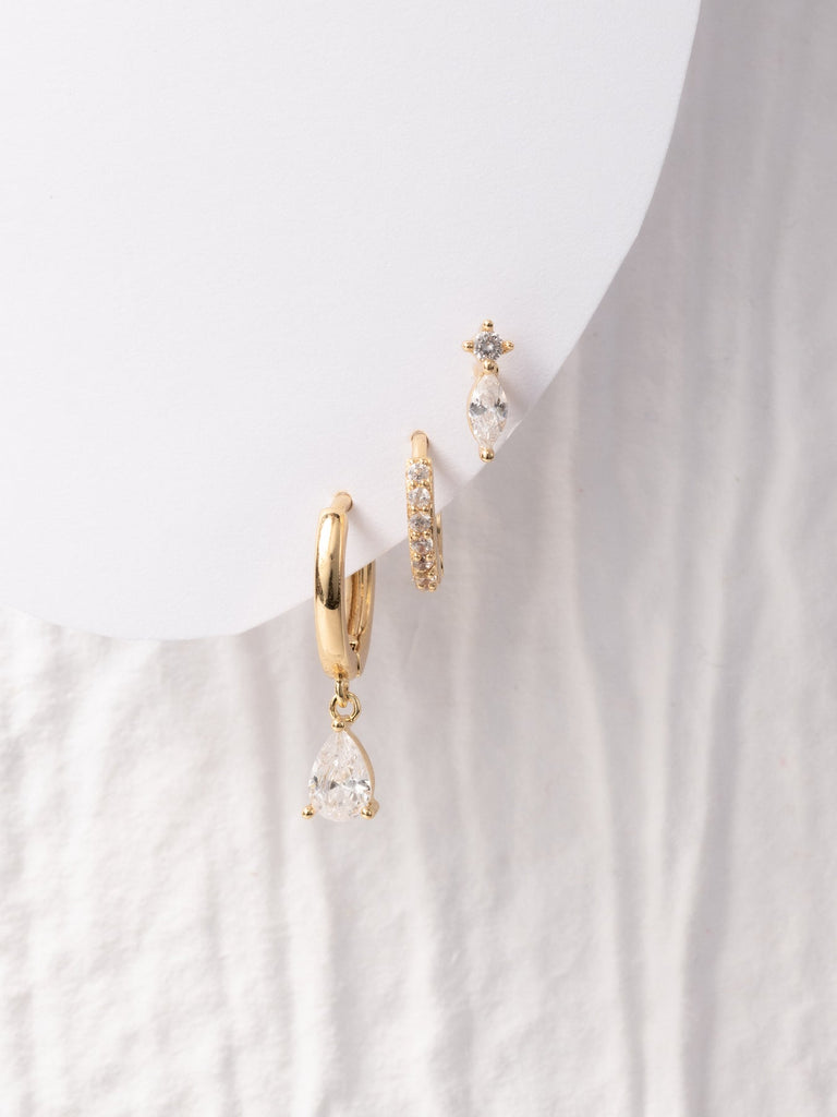 The Finn Earrings are like a tiny party pack for your ears! This fun trio of huggie hoops gives you three different ways to sparkle – smooth and sleek, textured and touchable, or dazzling with shine. Mix them up like your favorite playlist, stack all three for maximum ear candy, or let one fly solo when you're feeling picky! Feather-light and comfy enough to wear through dance parties and power naps alike, these mini hoops add just the right amount of pizzazz to make your bedhead look intentional and your fancy outfit even fancier. Who knew your earlobes could have this much fun?