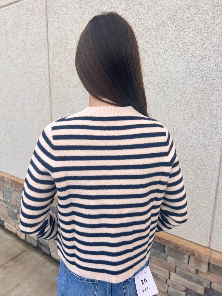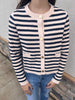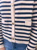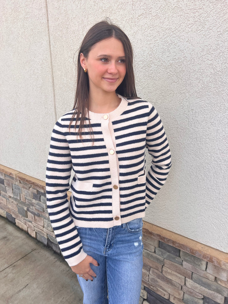 Enhance your everyday wardrobe with the Tessie Striped Knit Cardigan, a refined piece that seamlessly transitions from office to weekend. Crafted from luxuriously soft nylon, this cardigan features a timeless cream base with navy stripes for understated elegance. Polished gold buttons add a touch of sophistication, while practical front pockets keep essentials within reach. The flattering waist-length silhouette creates a graceful, tailored look that pairs effortlessly with any ensemble.