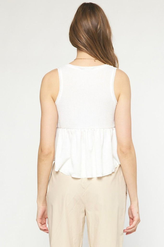 This off-white babydoll top features a solid ribbed knit with a flattering V-neckline. Lightweight and unlined, it’s perfect for layering without adding bulk. Its non-sheer fabric lets you dress it up or down effortlessly, making it a versatile and playful addition to your wardrobe.