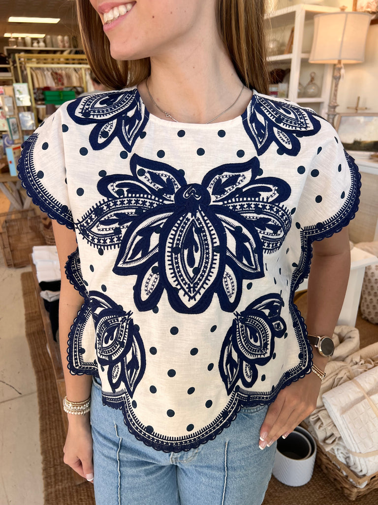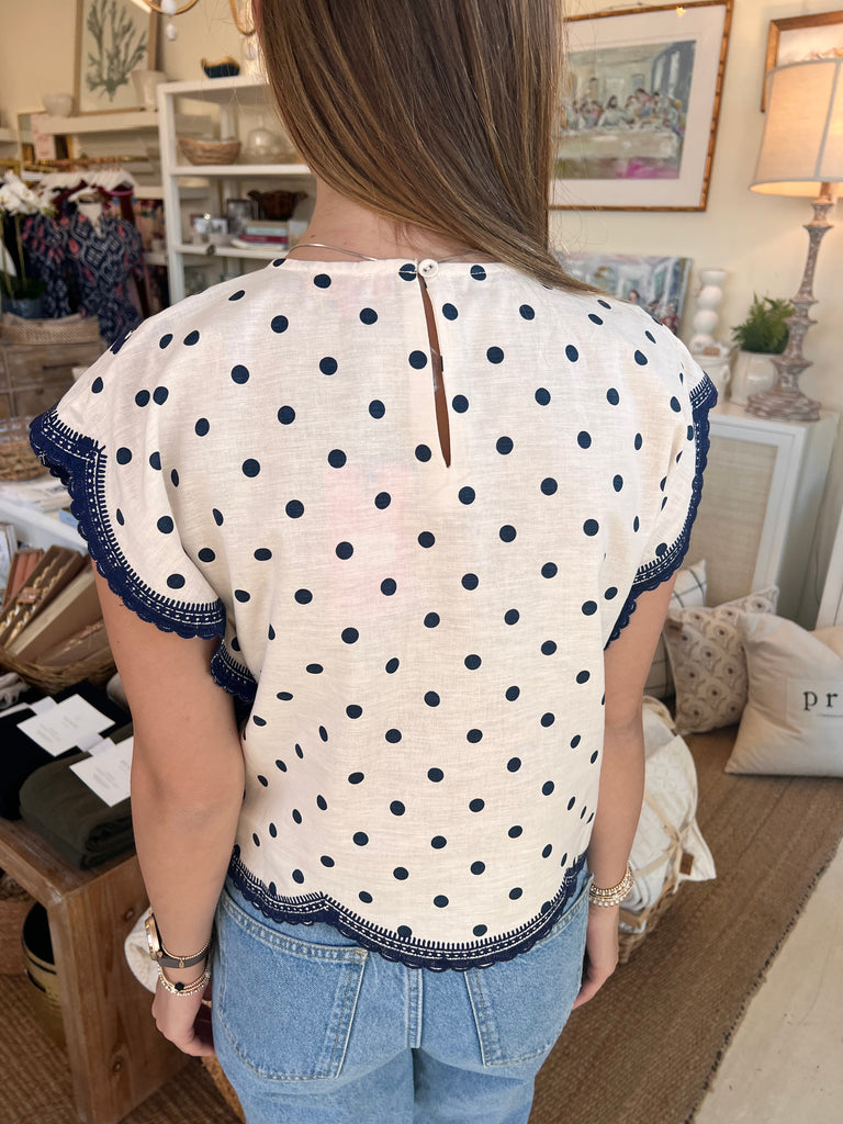 Fluttering into your wardrobe with effortless charm, this square-shaped top features delicate navy polka dots dancing across a cream background, accented with gorgeous navy blue embroidery. Crafted from a breathable linen-cotton blend (55% linen, 45% cotton), it's designed for comfort and style. The back neck button clasp adds a sweet, unexpected detail. Dress it down with denim shorts for a casual vibe or pair with classic jeans for everyday elegance. A playful piece that brings personality to any outfit.