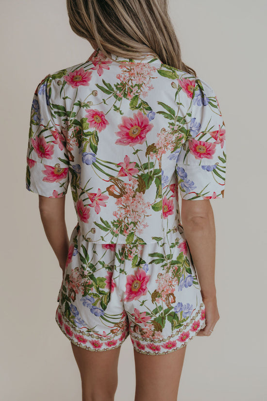 Elevate your wardrobe with the Fallon Harbor Island Floral Top, featuring a charming Harbor Side Floral print on premium cotton poplin. This cropped silhouette showcases a collared v-neck with a button placket and covered buttons for a polished, refined look. The tailored fit flatters beautifully—our model is 5'8" and wears a size XS. Perfect for layering or wearing solo, this versatile piece transitions seamlessly from casual to dressed-up occasions. Dry clean only.