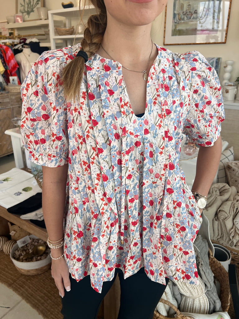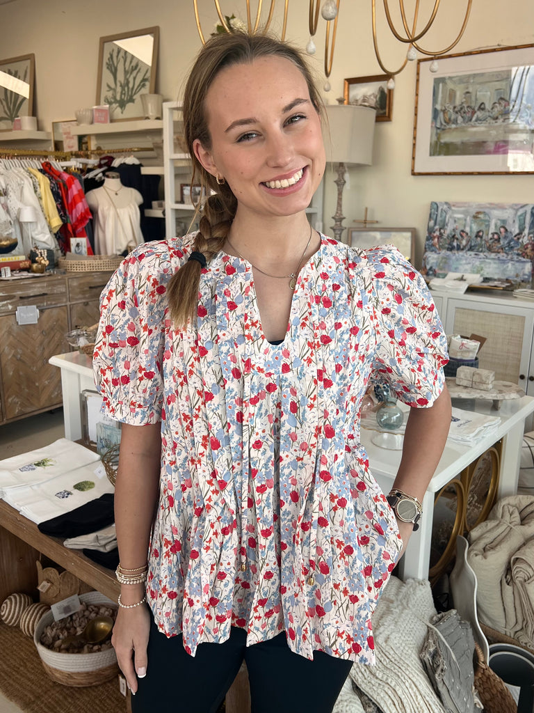 The Haru Floral Spritz Top brings effortless charm to your everyday wardrobe. Crafted from 100% cotton, this playful piece features delicate pink and blue flowers dancing across a crisp white background, accented with intricate stitch detailing. The circular V-neckline with charming ties adds a touch of elegance, while short puff sleeves deliver a sweet, feminine vibe. Slip it on with your favorite jeans and cute shoes for an instantly put-together look that feels fresh and fun.