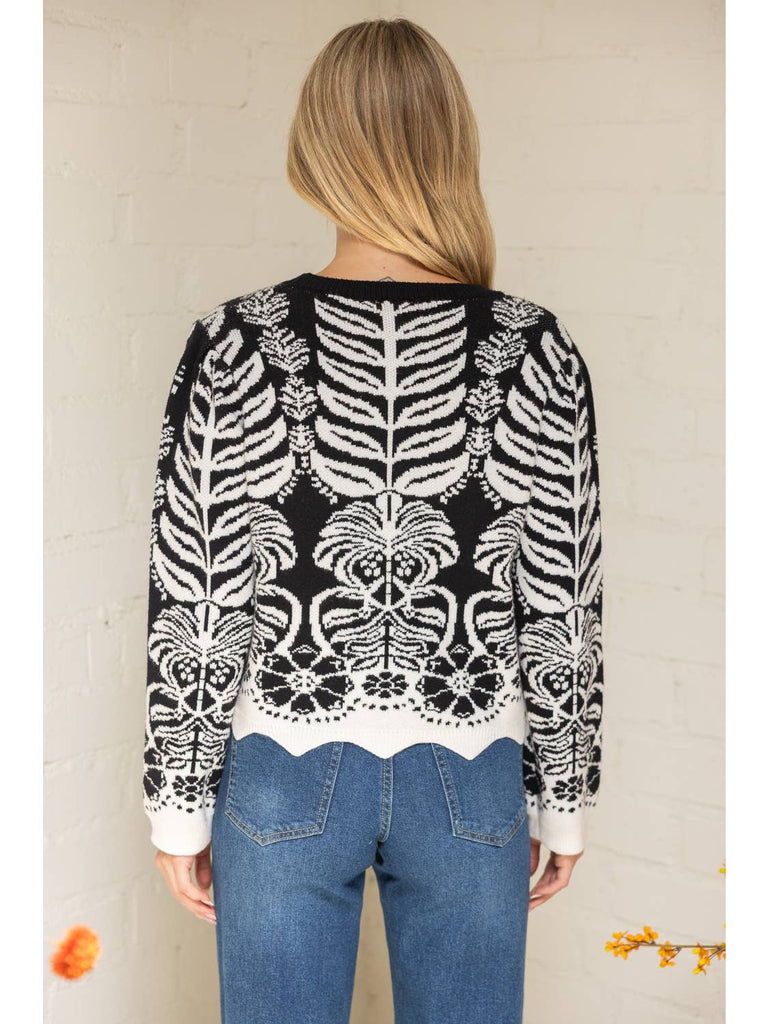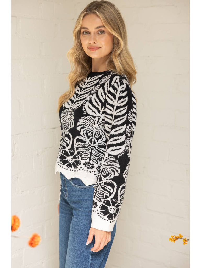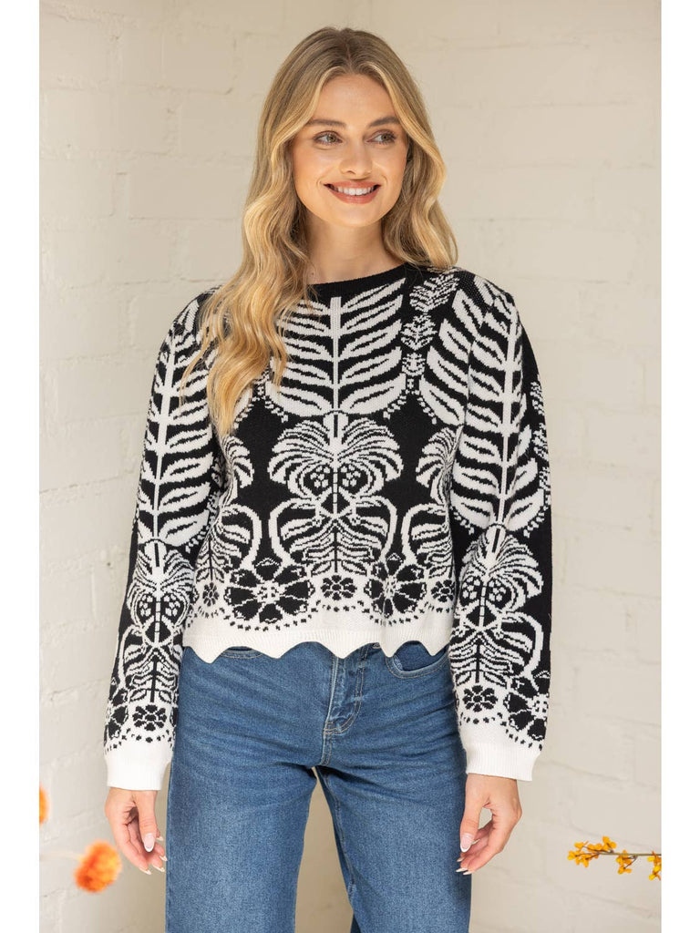 Elevate your seasonal wardrobe with this striking knit pullover, where sophisticated design meets everyday versatility. The black base showcases an intricate ivory floral and leaf pattern, creating visual interest that transcends trends. Crafted with a classic round neckline, long sleeves, and refined ribbed trim, the scalloped hem adds an unexpected textural element that distinguishes this piece. Layer it over basics or wear solo—this statement sweater transitions seamlessly from casual daytime looks to polished evening ensembles, pairing beautifully with denim, tailored trousers, or flowing skirts.