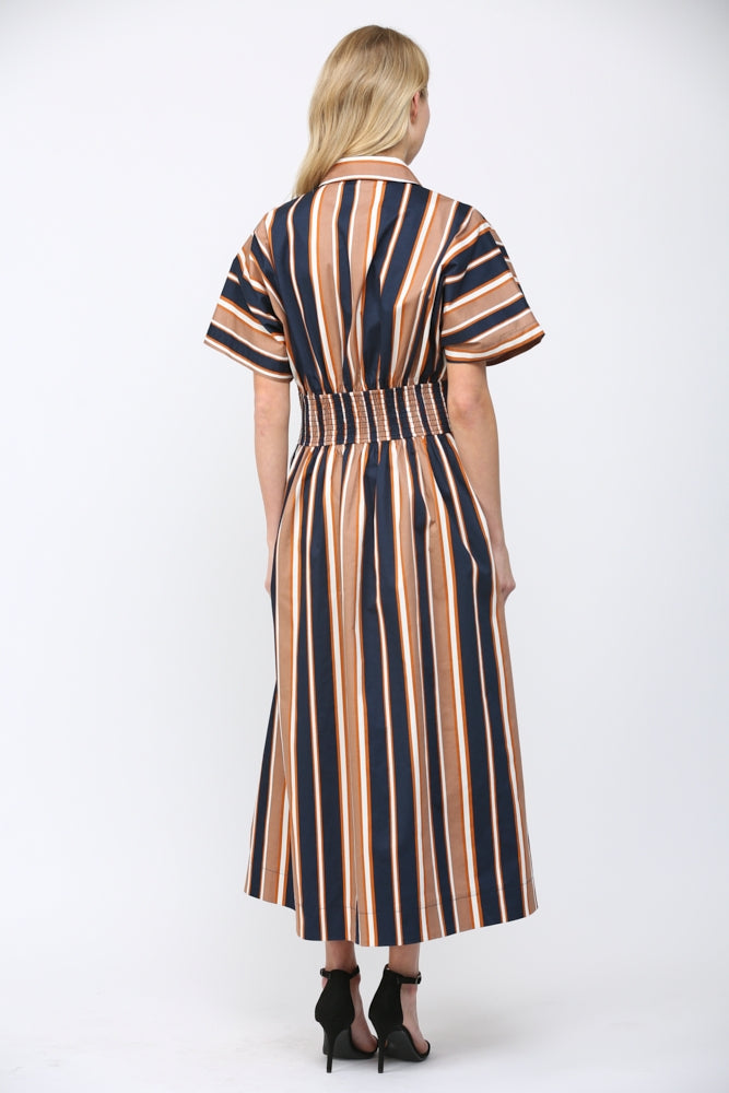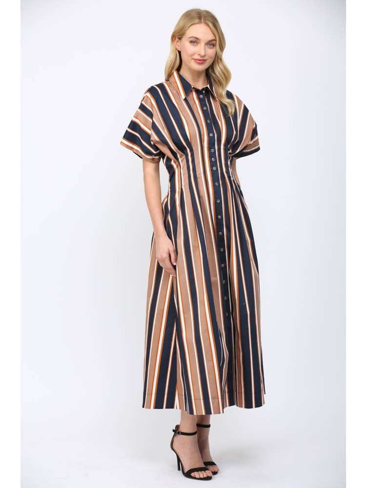 Effortlessly chic and undeniably versatile, this navy multi-stripe dress combines comfort with contemporary style. Crafted from a breathable cotton-blend fabric with just a hint of stretch, the relaxed dolman sleeves create an elegant silhouette while the cinched waist defines your shape beautifully. Perfect for transitioning from day to evening, this piece pairs seamlessly with sneakers or heels. Model is 5'9½" for reference.