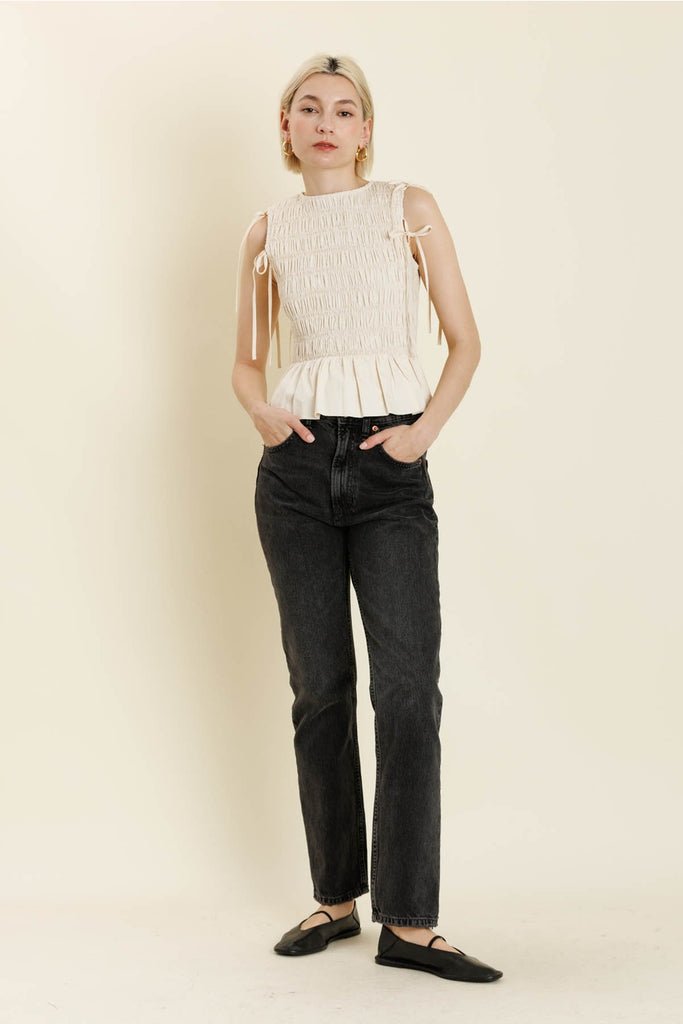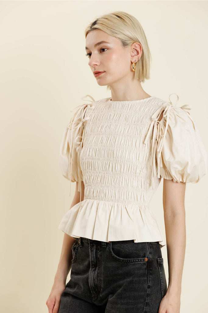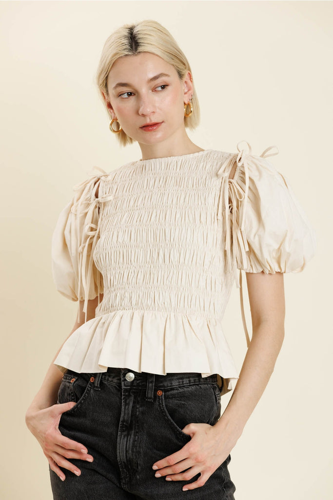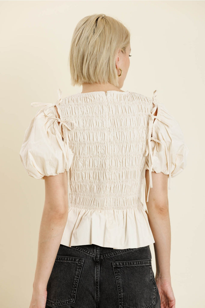 The Ashya Peplum Top in Eggshell brings a fun twist to your wardrobe with its fully detachable puff sleeves, letting you switch up your look in a snap. Crafted from crisp, non-stretch cotton poplin, it features an elasticated, smocked bodice for a comfy, flattering fit. The back zipper closure adds a sleek finish, making this top as easy to wear as it is stylish. Perfect for playful days and chic nights!