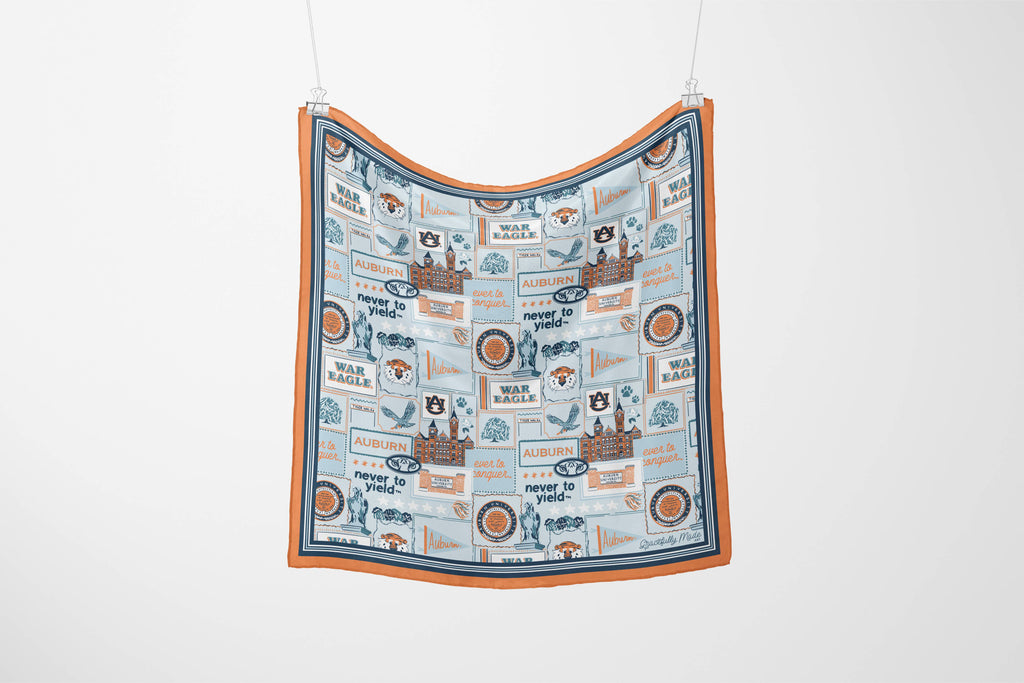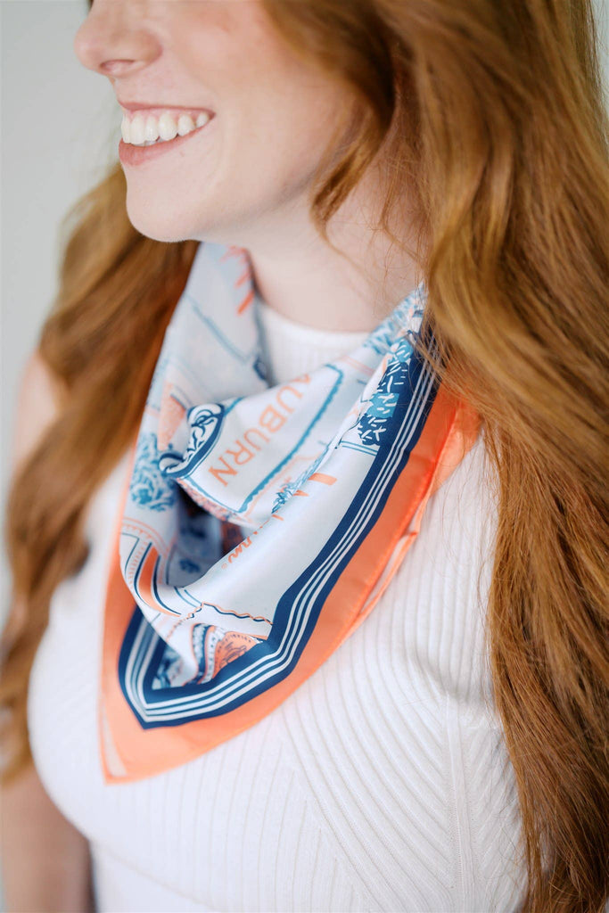 Add a touch of Auburn spirit to any outfit with our hand-illustrated silk scarf! Whether you tie it in your hair to elevate your game day look, wrap it around your neck, or add it to your purse for a pop of color, this versatile accessory is the perfect way to showcase your Tiger pride in style. 34x34 inches
