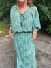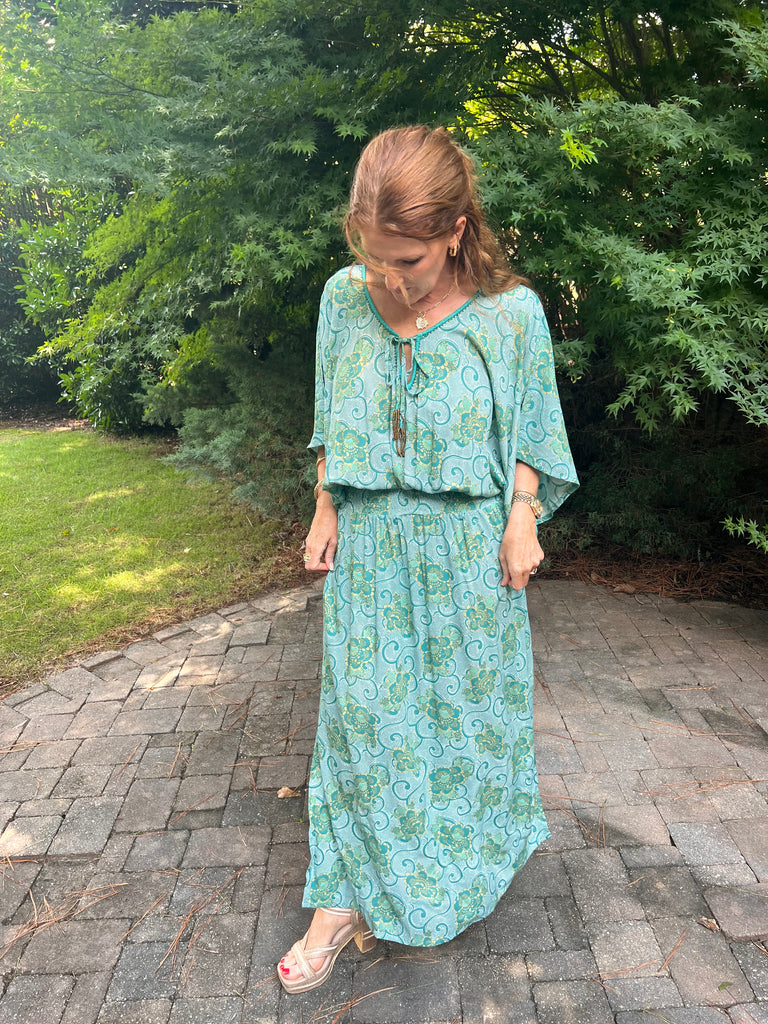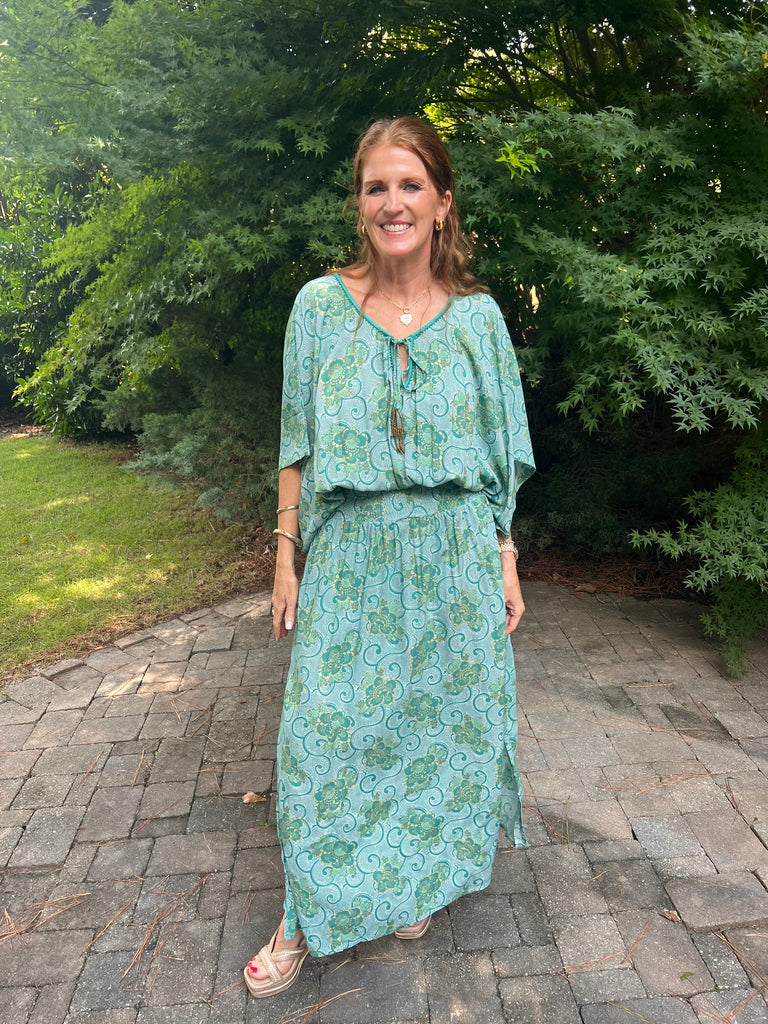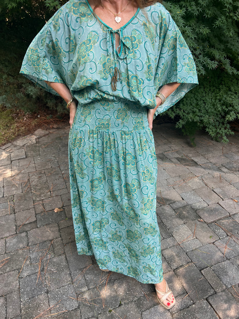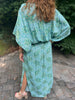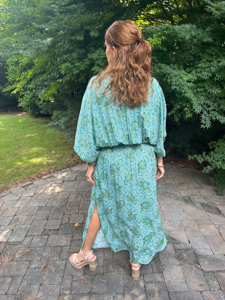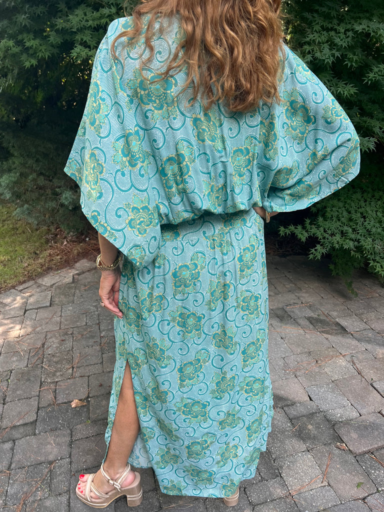 Embrace bold elegance with the Batik Green Butterfly Dress. Featuring a daring side slit and a ruched waist, this maxi dress flatters your silhouette while allowing effortless movement. Its vibrant floral pattern in rich greens and golds makes it perfect as a standout dress or a stylish cover-up. Step confidently into any occasion with this striking piece that blends comfort and eye-catching design.