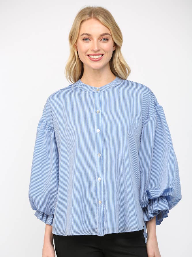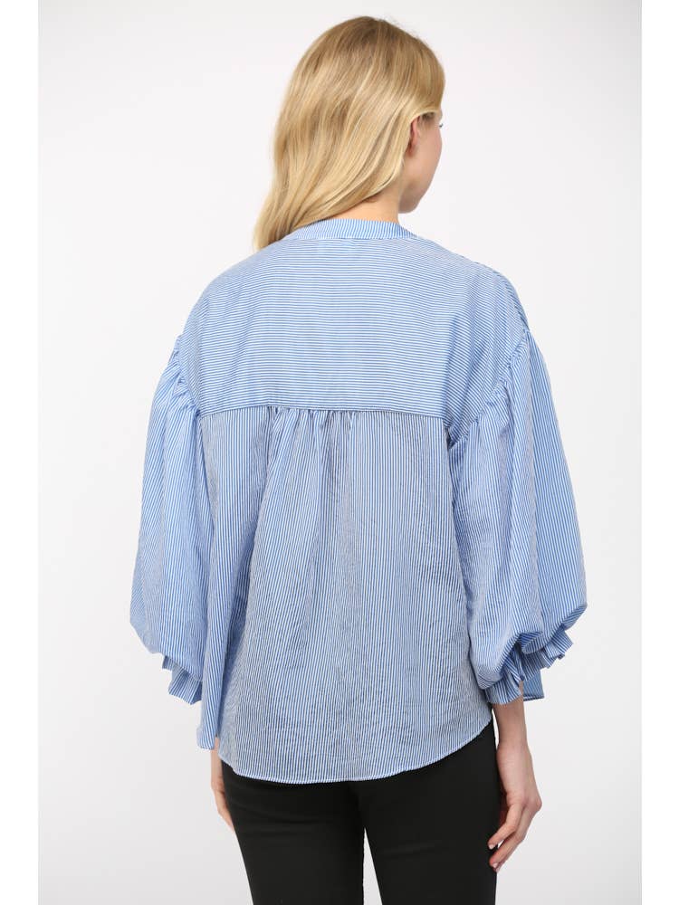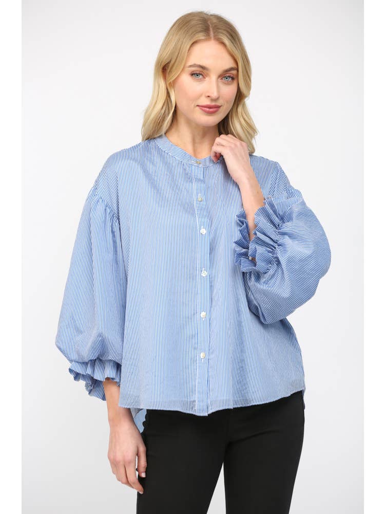Make a statement in this blue pinstripe blouse with voluminous bubble sleeves that steal the show. Choose between a silky rayon-nylon blend for a drapey short sleeve or a structured cotton-poly long sleeve—both deliver that perfect balance of comfort and style. The exaggerated sleeves add a whimsical touch that transforms any basic outfit into something special. Model is 5'9½" for fit reference.