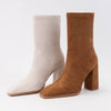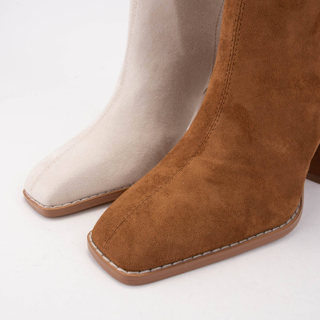 Step out in style with the Camille Slim Fit Ankle Boots in tan faux suede. Featuring a trendy square toe and a narrow, slim fit around the ankle, these booties hug your feet with confidence. At 7" shaft height and a sleek 3.75" heel, they effortlessly elevate any outfit while keeping you comfortably chic. Perfect for adding a playful twist to your wardrobe!